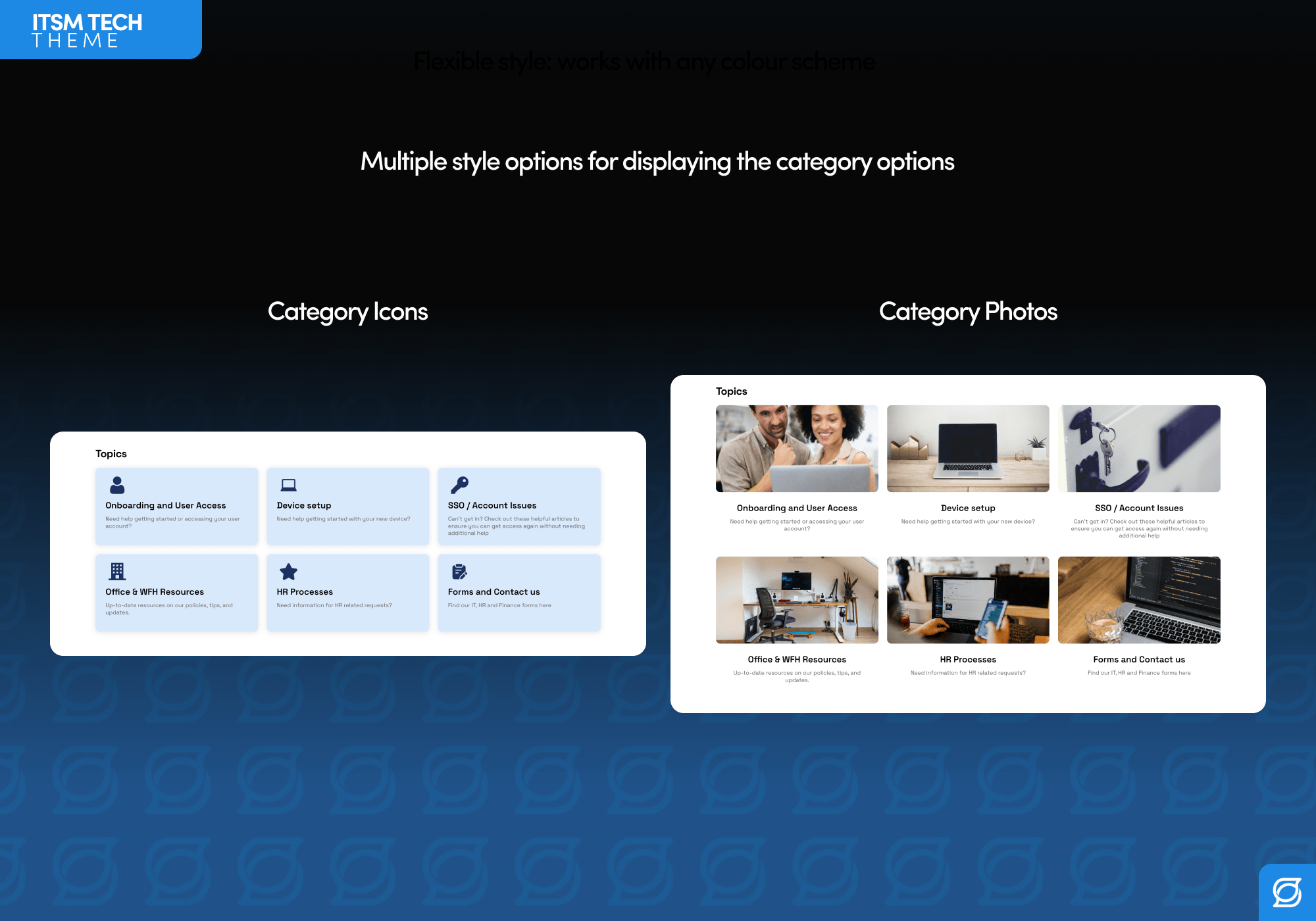 Additional custom category block: Show an additional block next to the category blocks. Perfect for providing a link to an external or internal source (such as submit a request, login portal, etc).