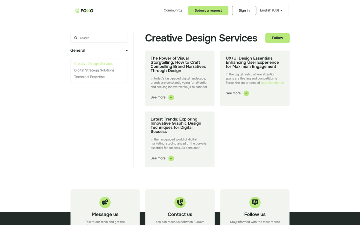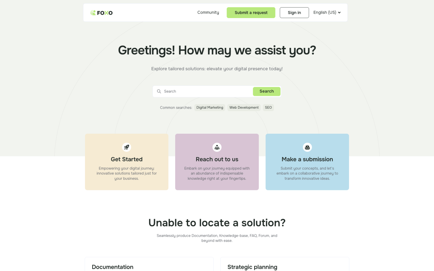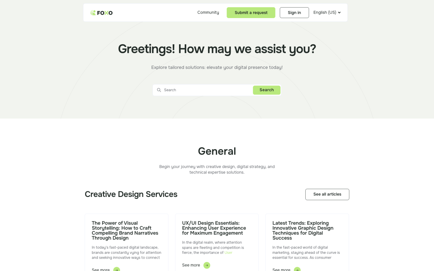 Foxo 128 is a sleek and modern Zendesk theme designed for various business sectors. It emphasizes Creative Design Services, Digital Strategy Solutions, and Technical Expertise, making it ideal for organizations seeking to provide top-tier support. The theme features a minimalist design and customizable pages, ensuring a visually stunning, strategically sound, and technically robust experience across all devices.