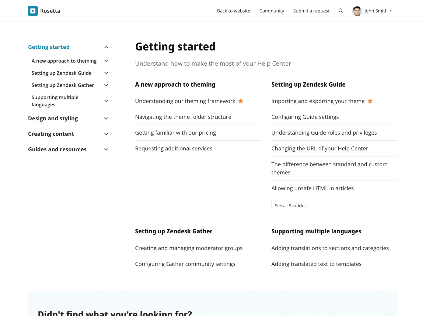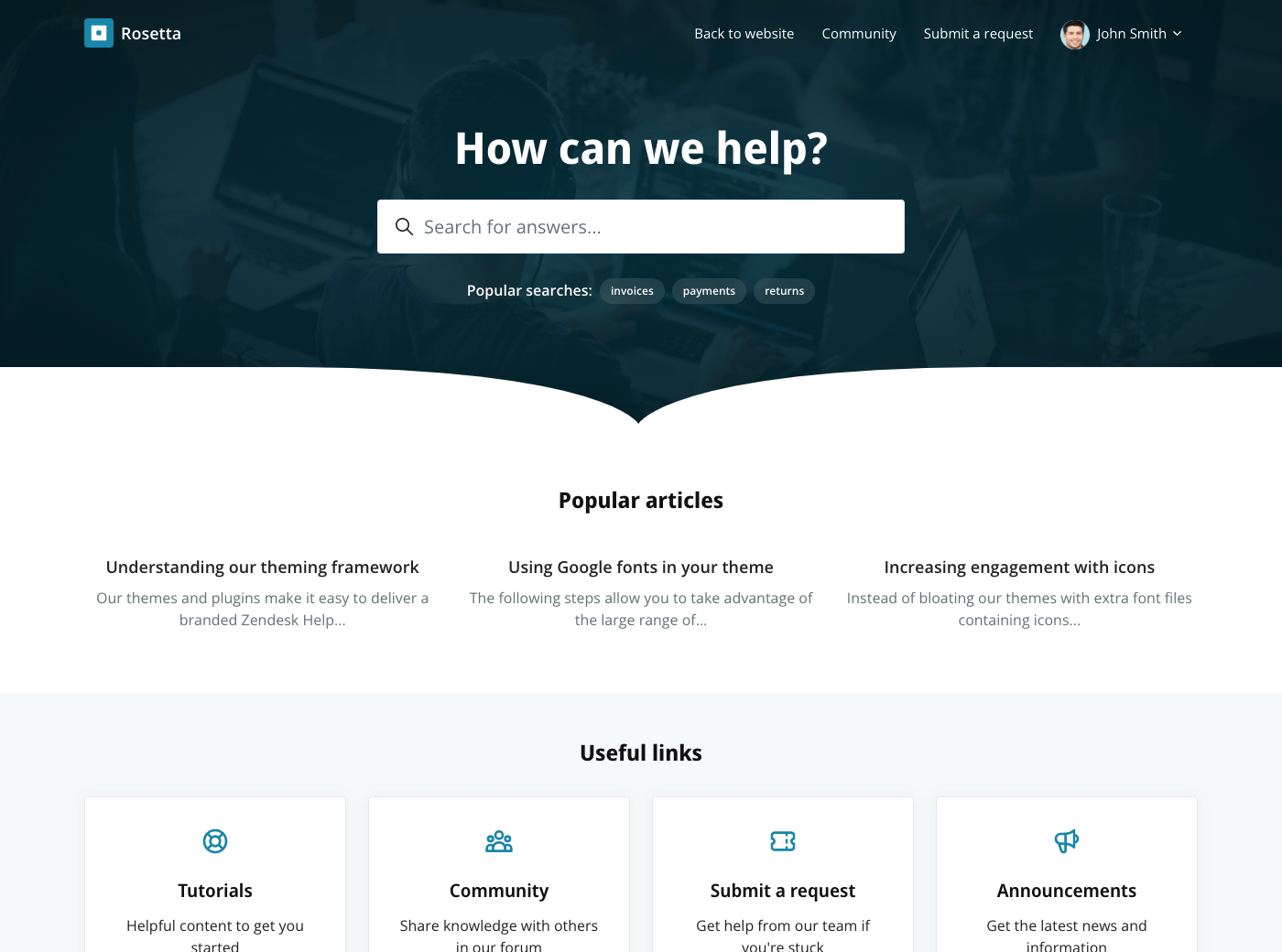 Rosetta is a beautiful and highly customizable theme for Zendesk Guide. It is designed to serve as a solid foundation on which to build an amazing knowledge base for your customers.