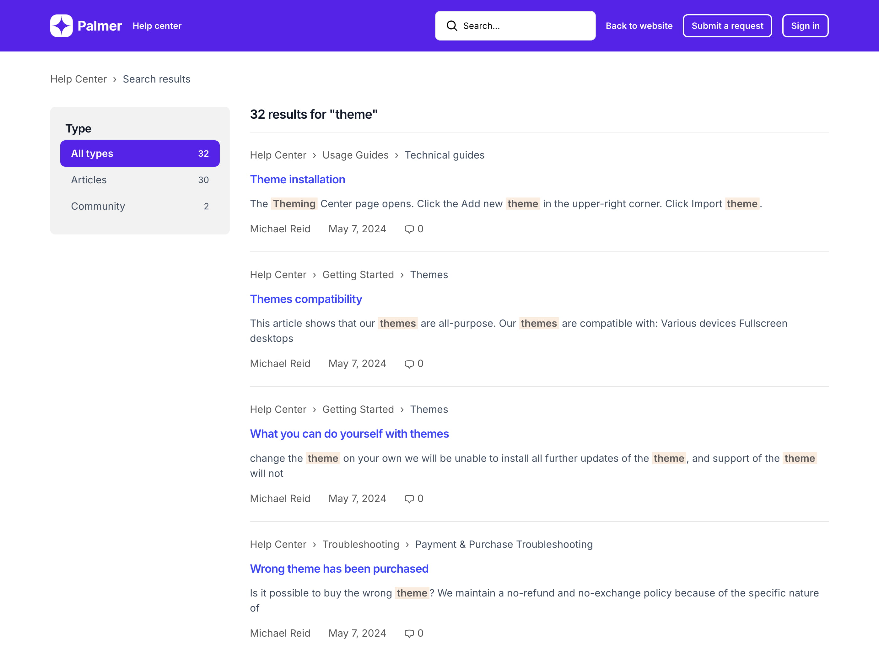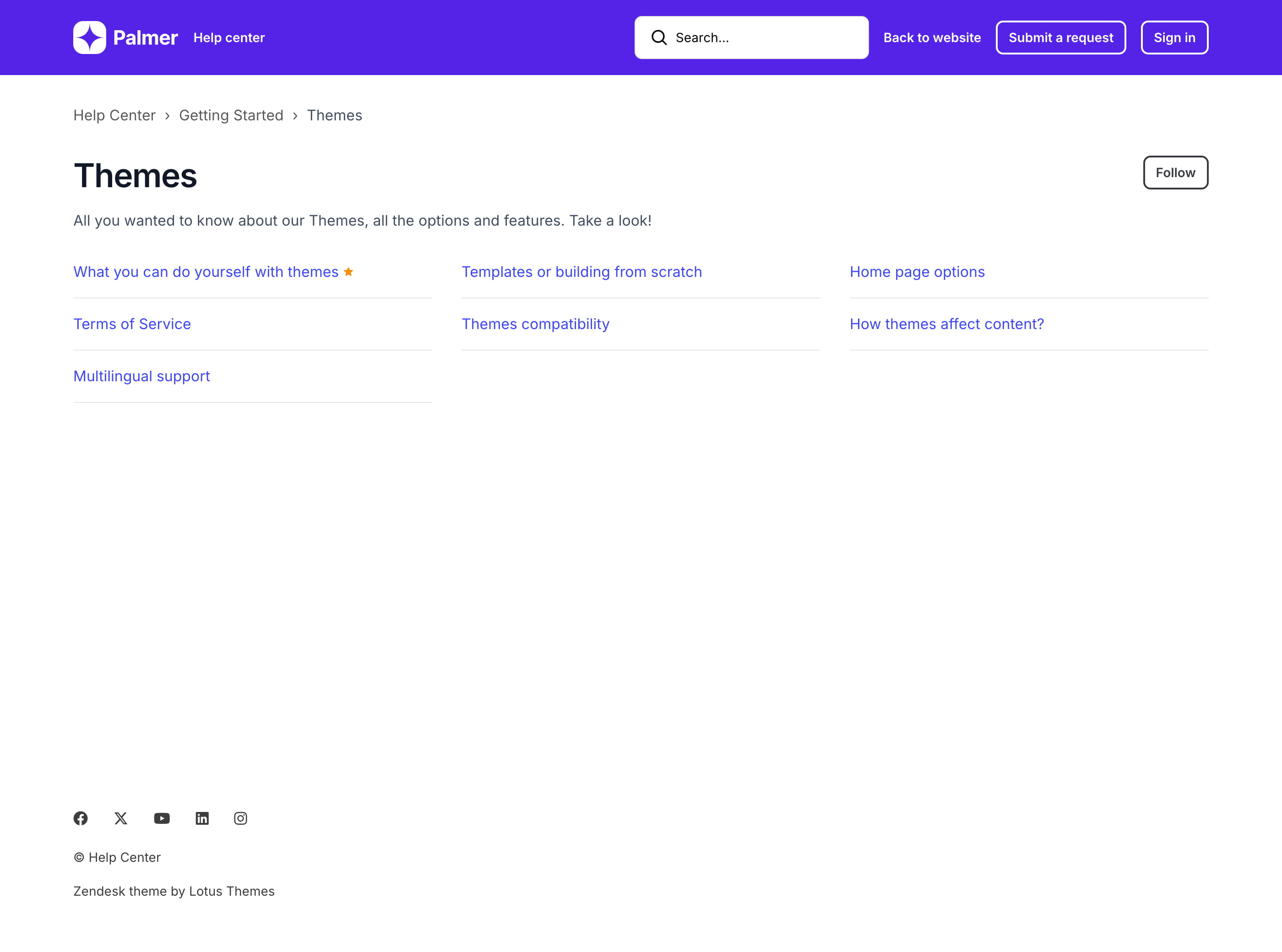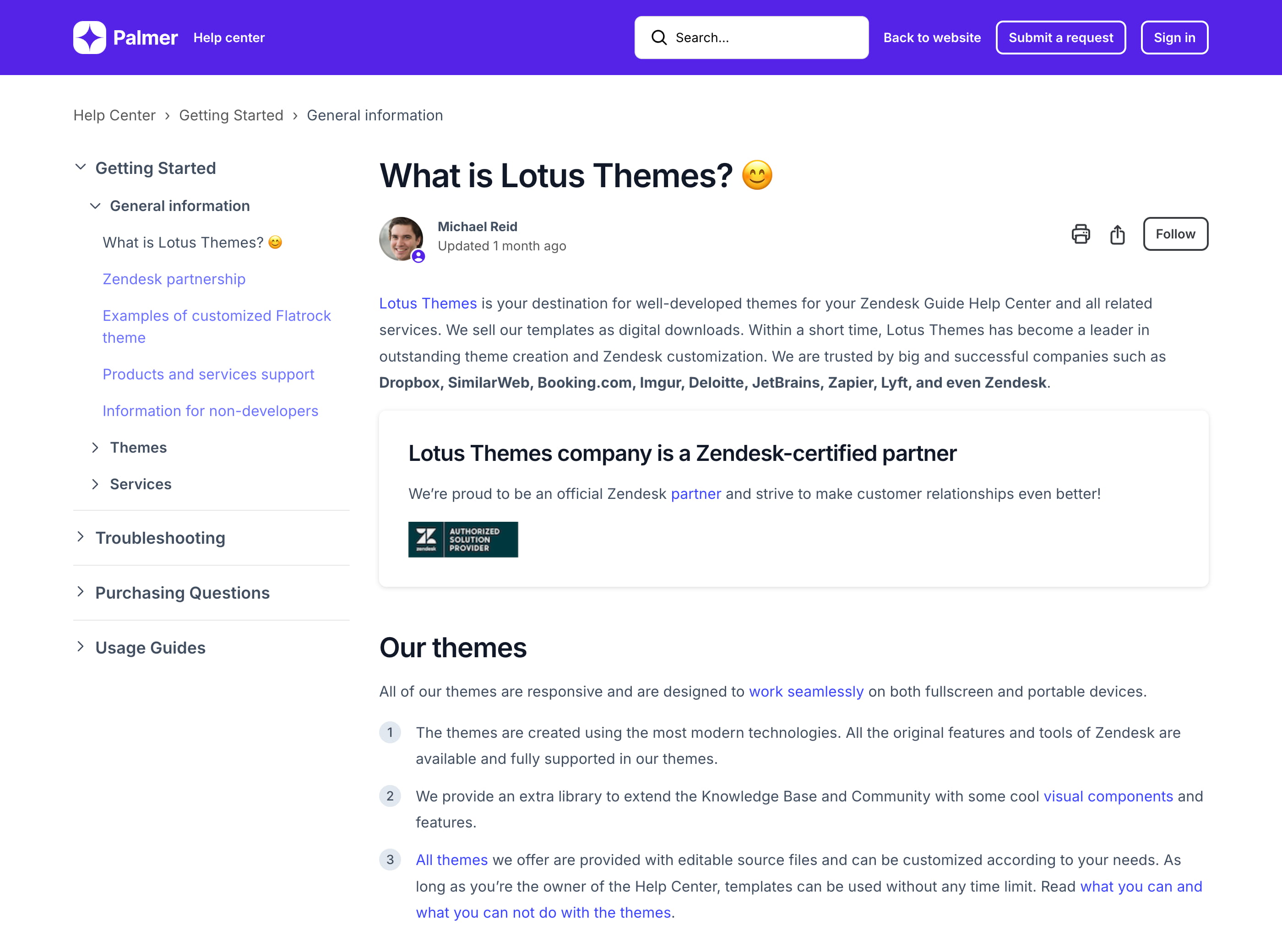 Palmer is a custom Zendesk theme that includes additional features like side navigation, prev/next buttons, and categories with icons on the homepage. Get a customized template and save about $400.