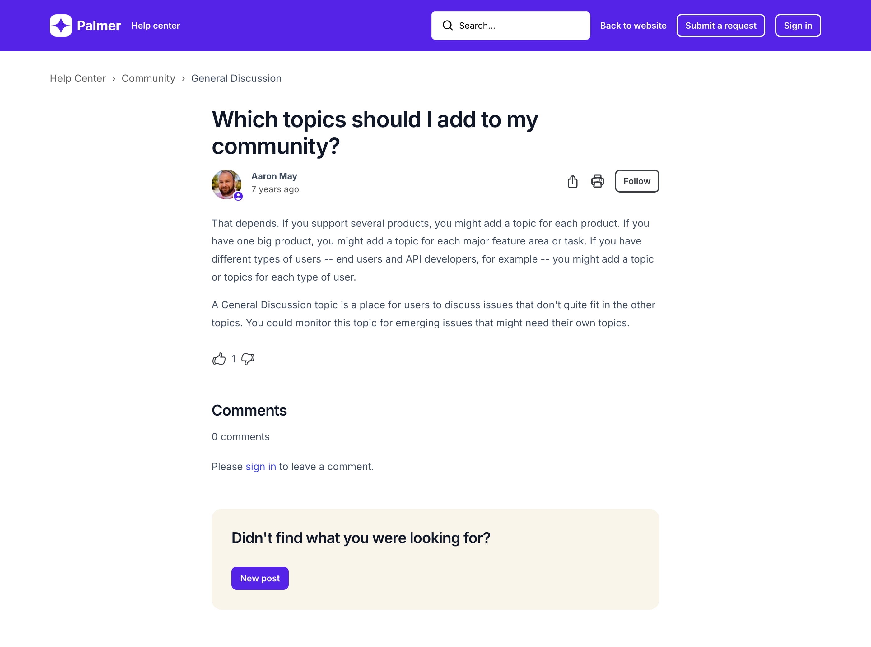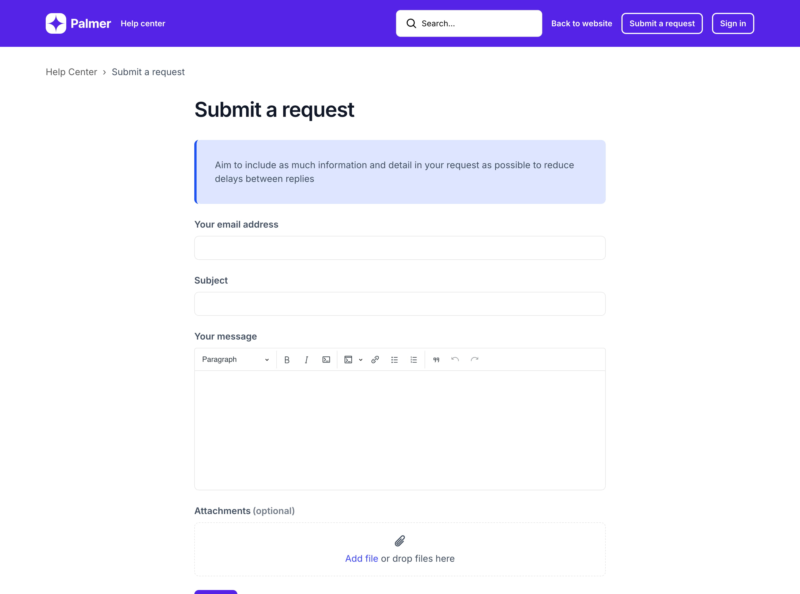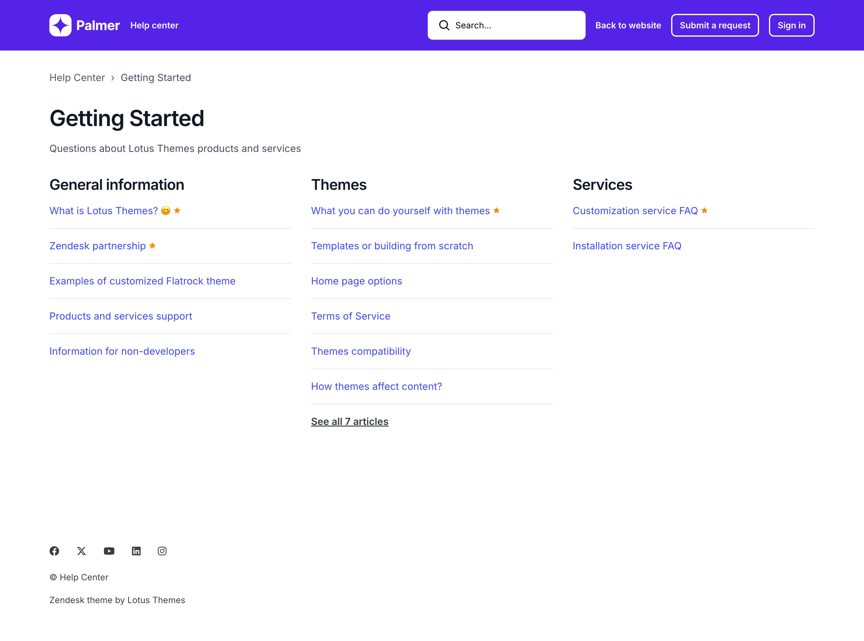 Palmer is a custom Zendesk theme that includes additional features like side navigation, prev/next buttons, and categories with icons on the homepage. Get a customized template and save about $400.