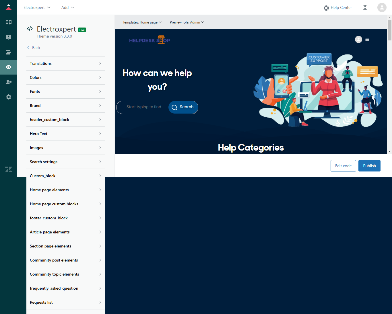 Custom Block Icons - Custom blocks are static links to any pages on your help center or your main website. It’s possible to change the link, icon, title, and description in each of them. You can hide a specific block or all of them in the theme settings and add more through customization.