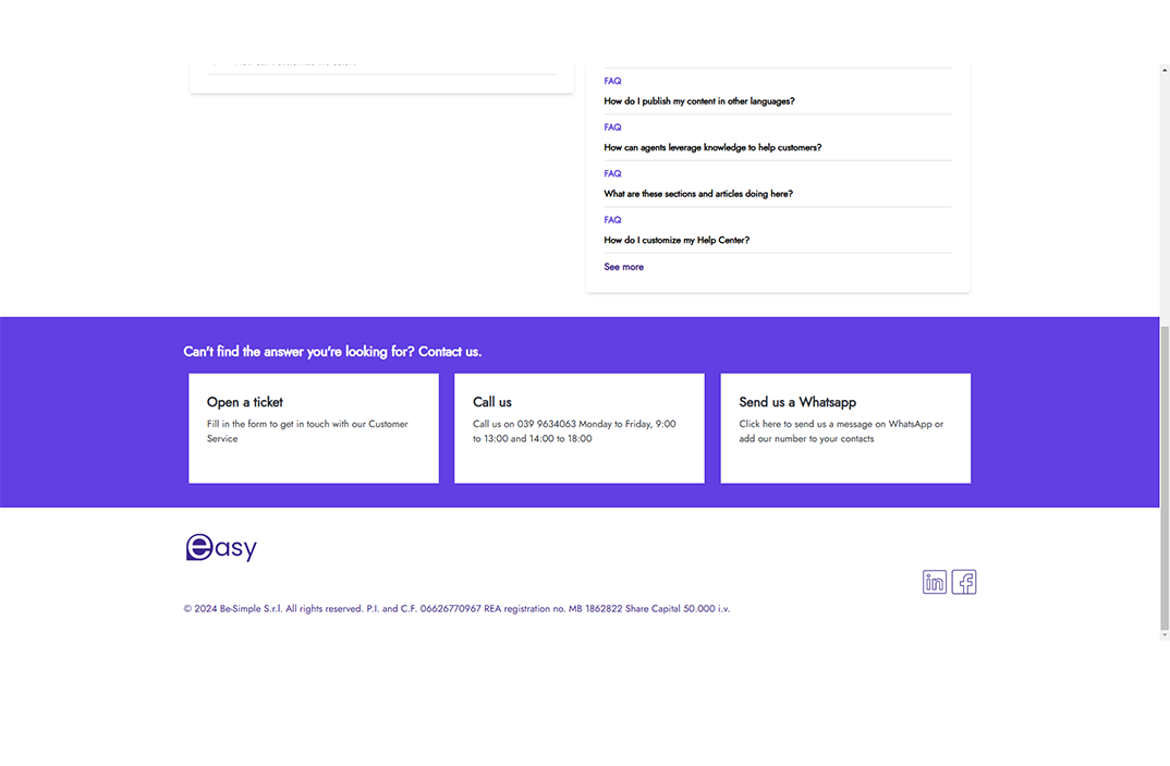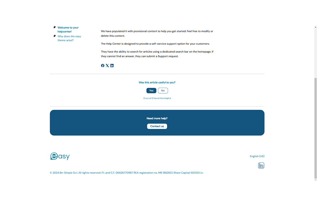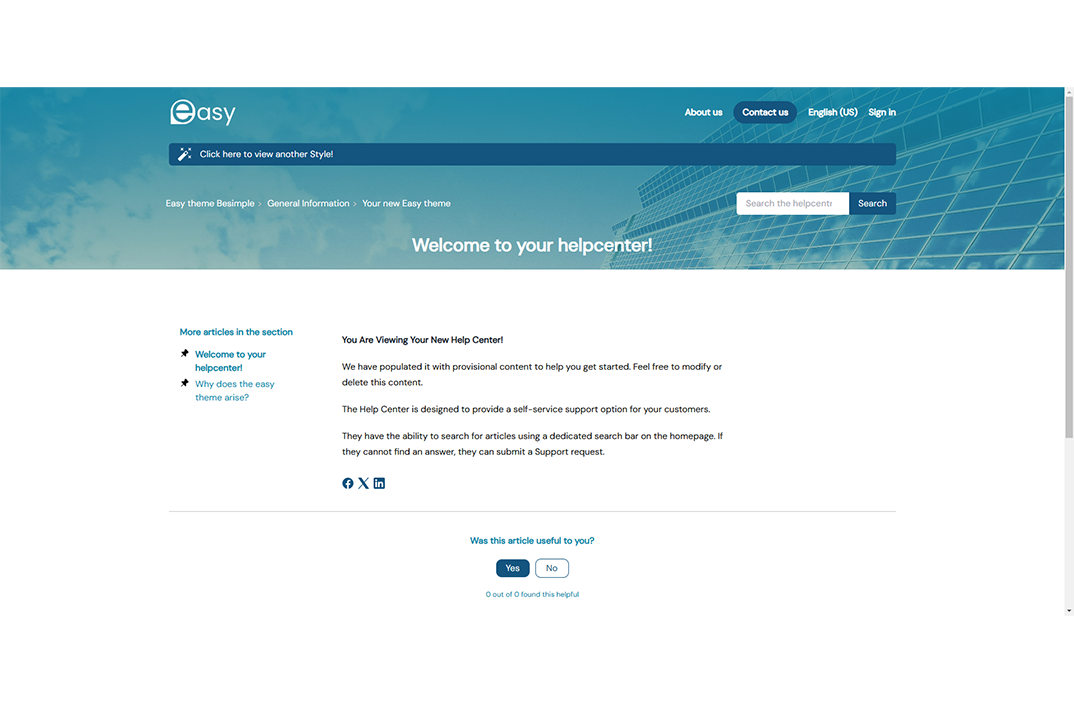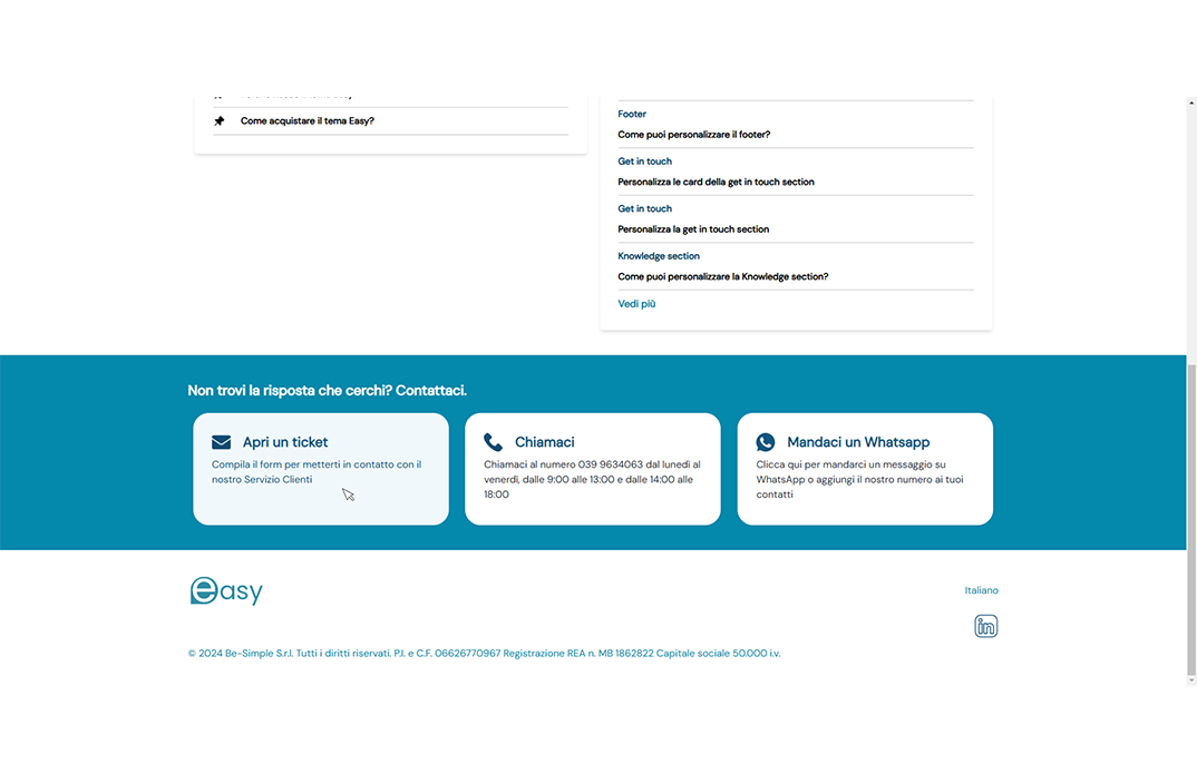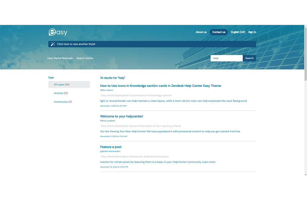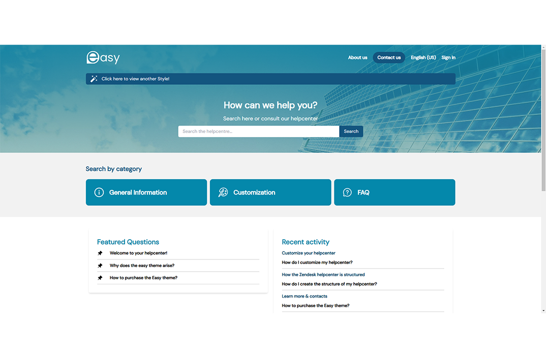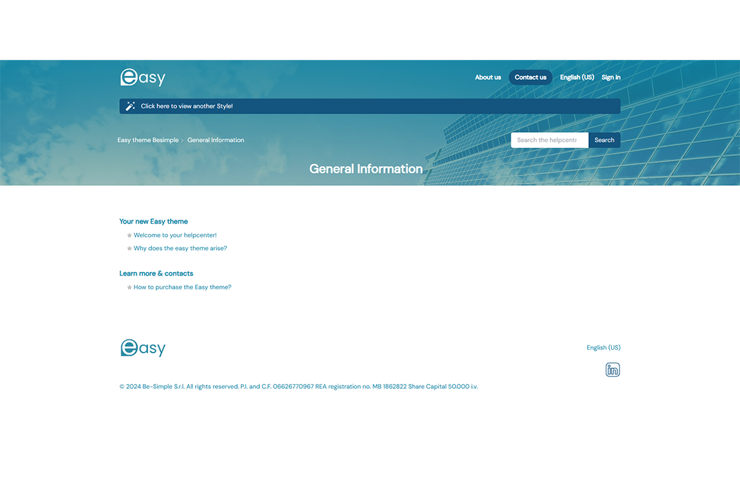 Il tema Easy è progettato per semplificare la personalizzazione del Zendesk Help Center, rendendolo accessibile anche a chi non ha competenze di programmazione. The Easy theme is designed to simplify the customization of the Zendesk Help Center, making it accessible even to those who have no programming skills.