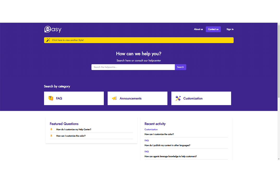 Progettato per essere intuitivo, il tema Easy permette agli utenti di tutti i livelli di creare e personalizzare un Help Center che rifletta il loro brand senza essere un programmatore.