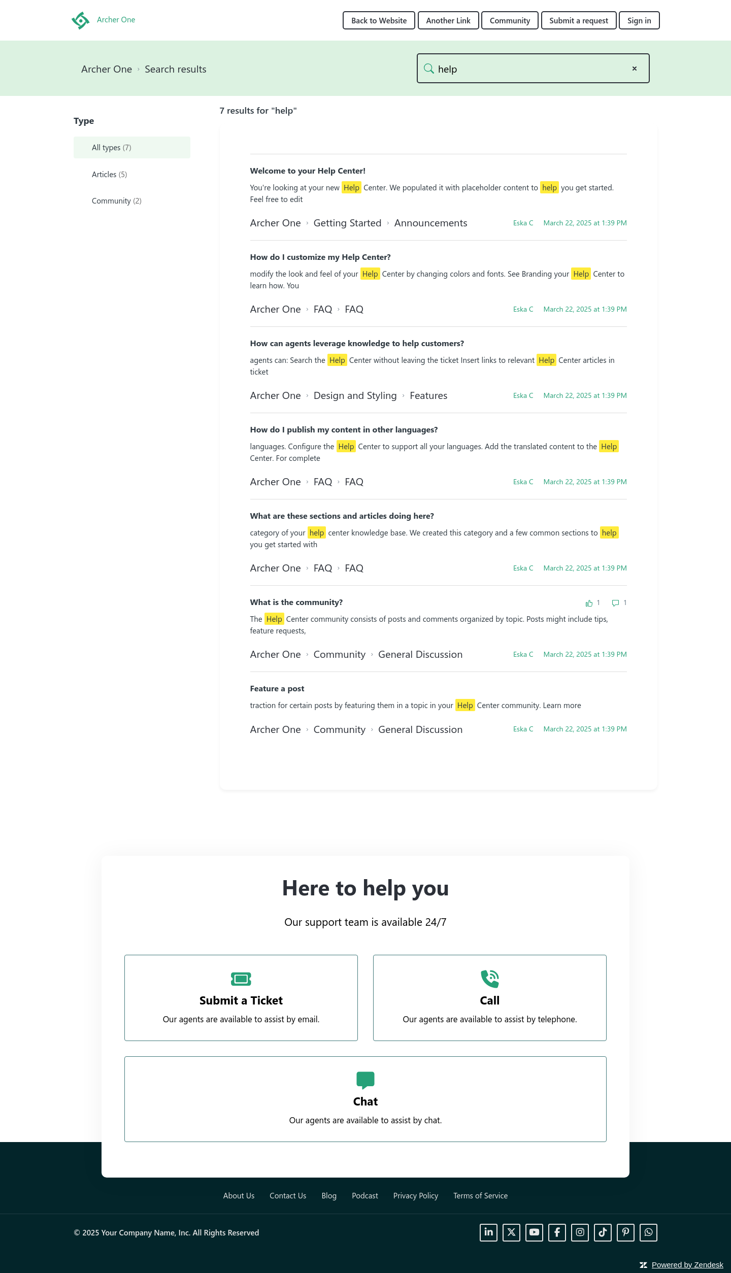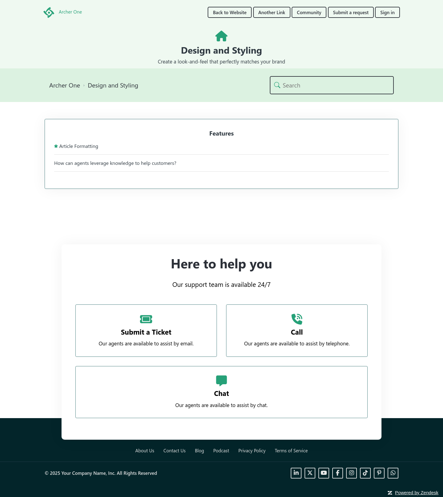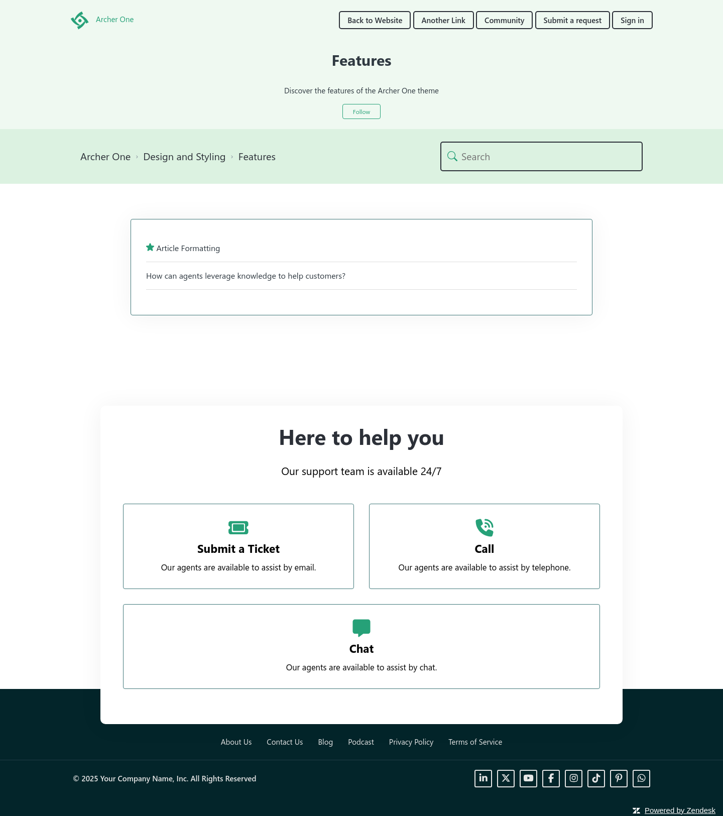 Archer One provides a modern, responsive layout that makes customizing your help center a breeze. Get started with an engaging design featuring multiple category boxes , along with fully customizable header and footer. This flexible structure not only helps organize your content in a visually appealing way but also ensures that your users can easily navigate your help center.