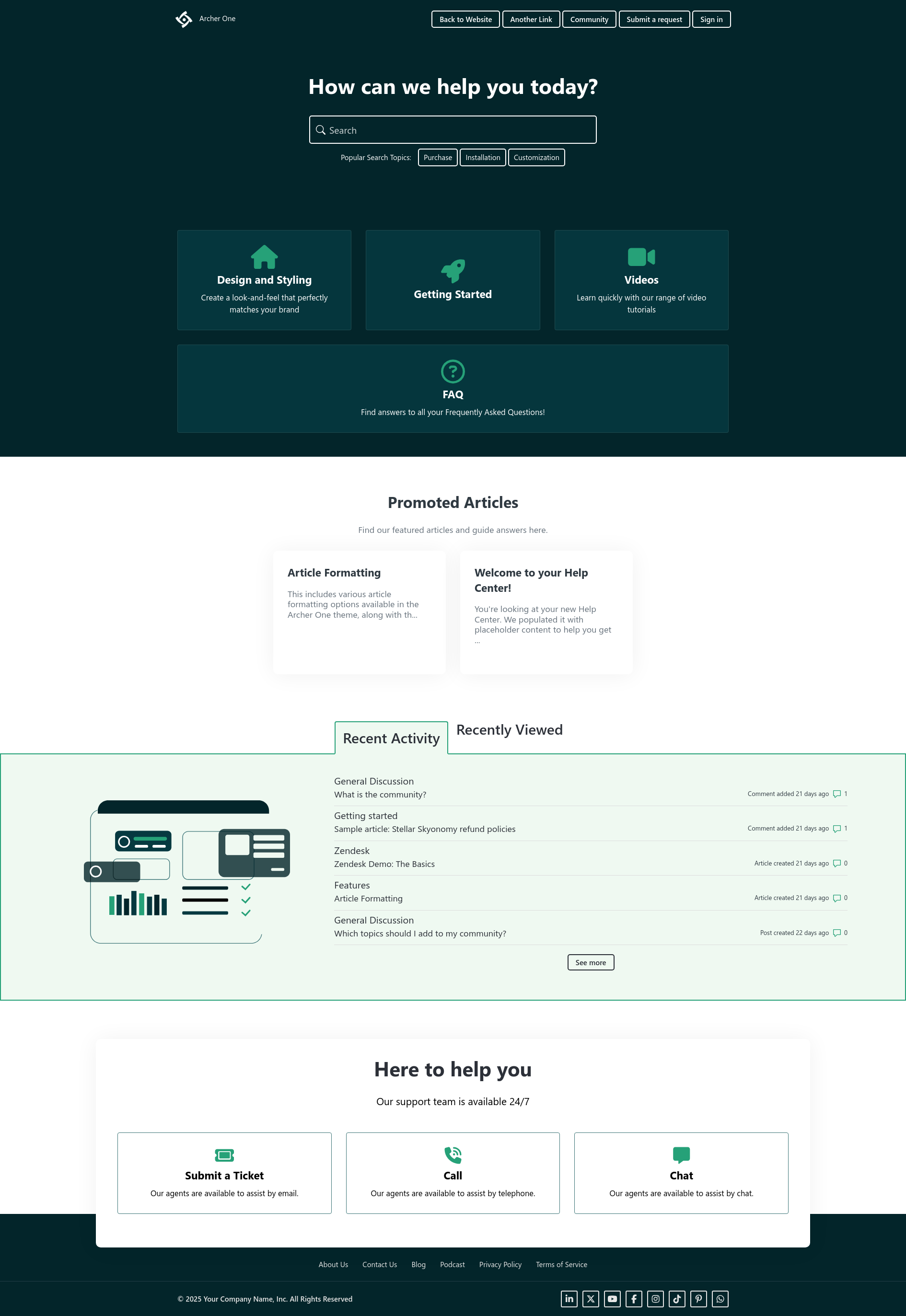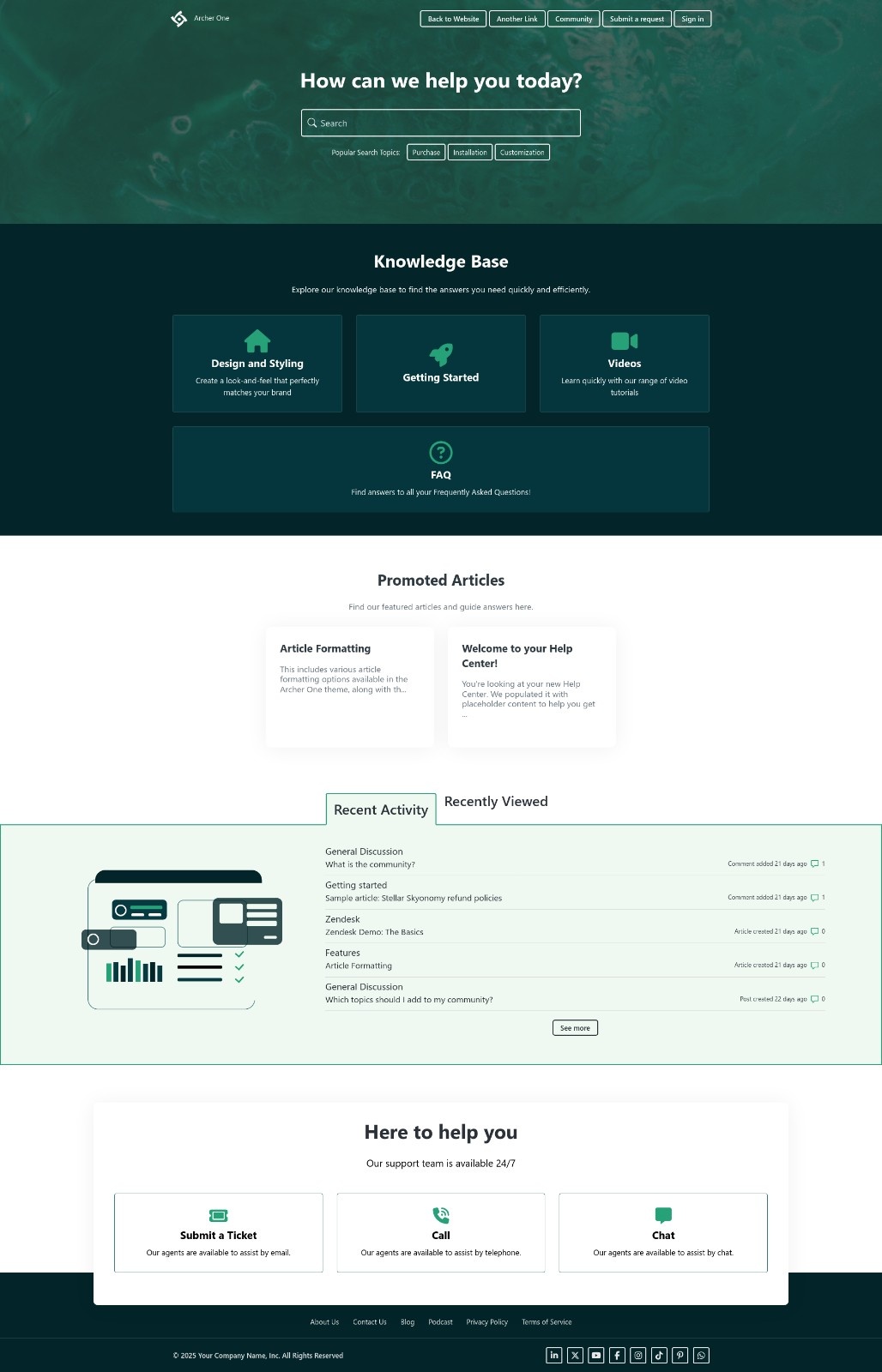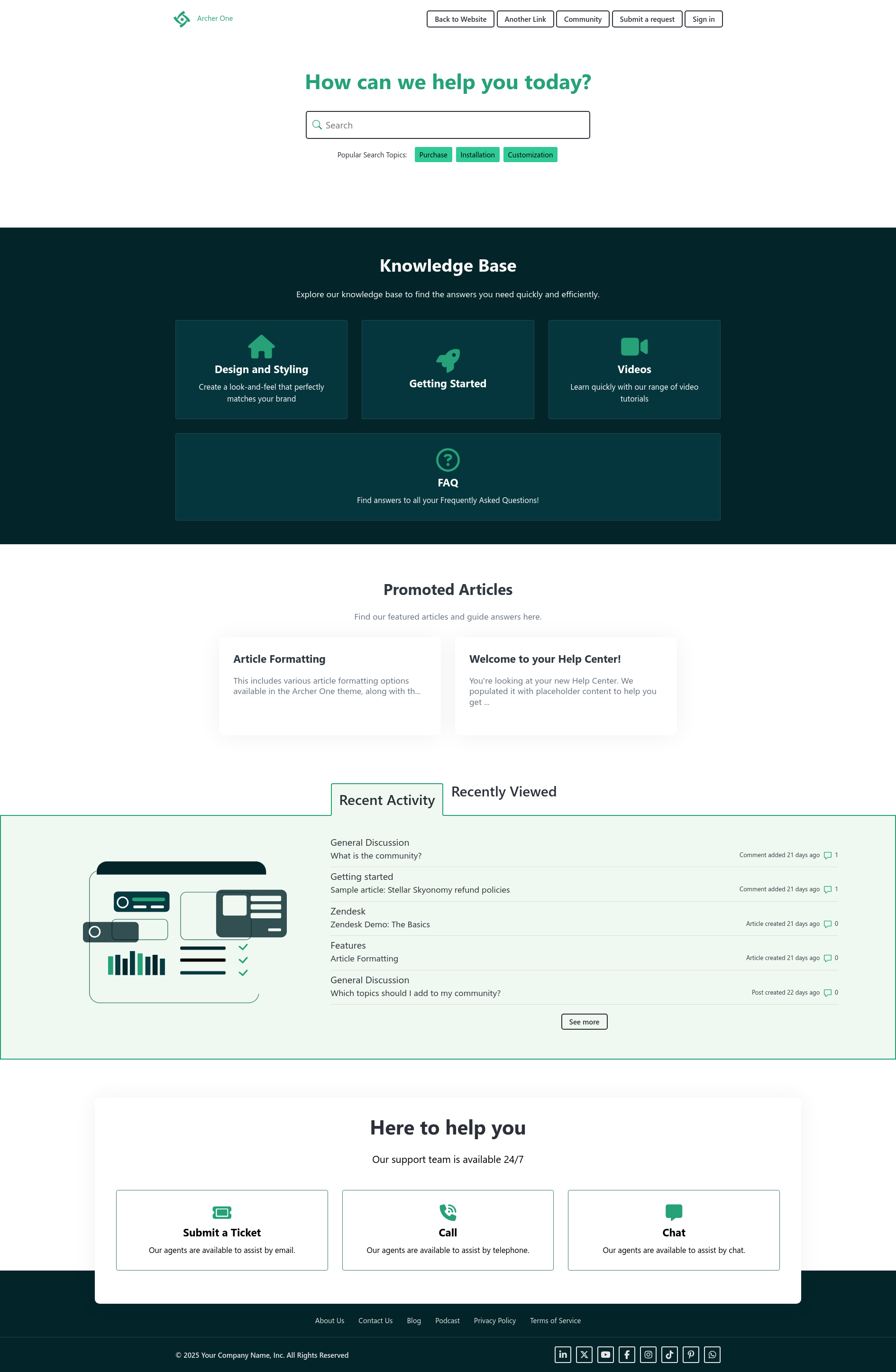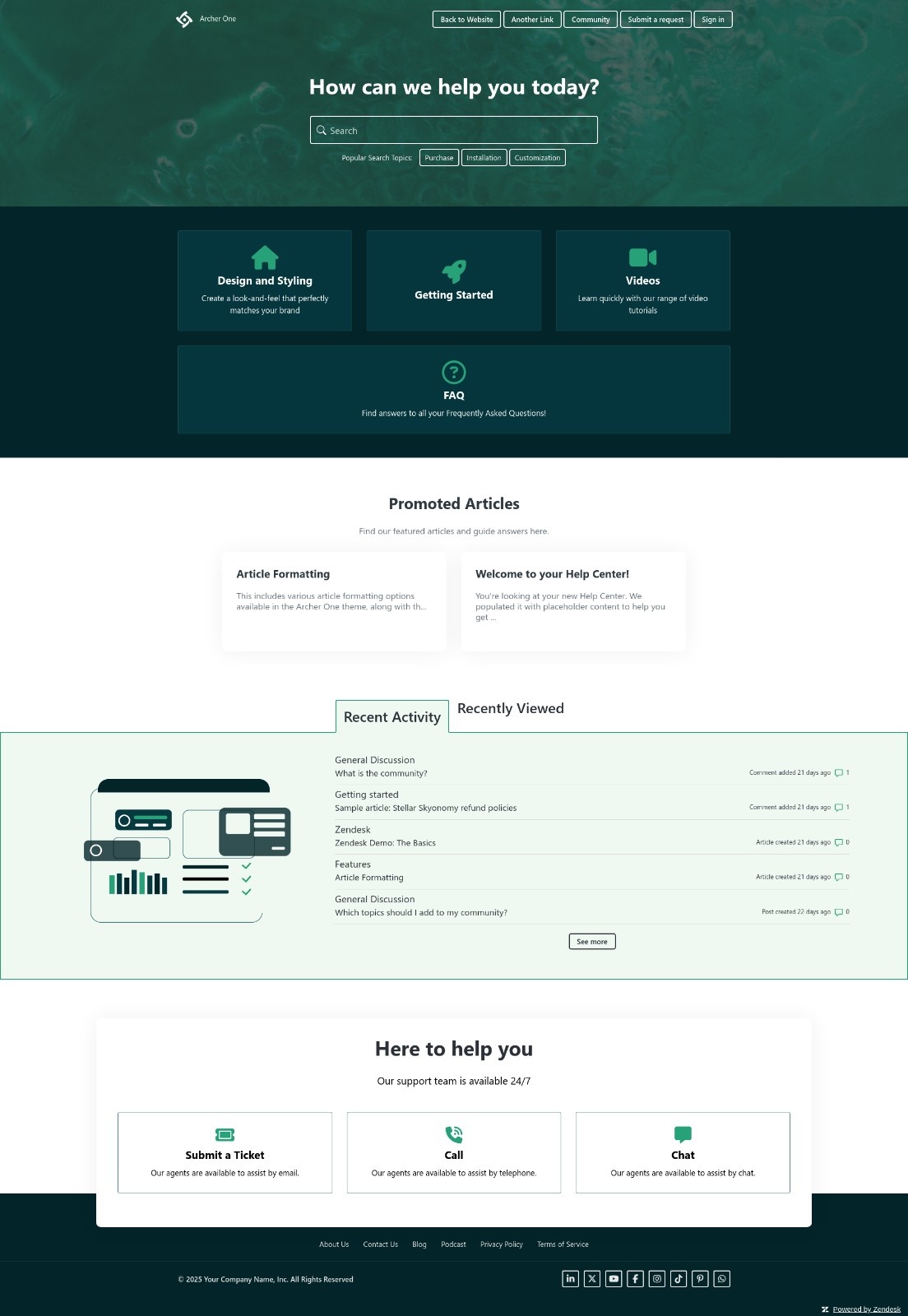 Archer One is a user-friendly Zendesk theme designed for easy customization. With built-in settings, it allows you to fully brand your theme effortlessly—no coding required.