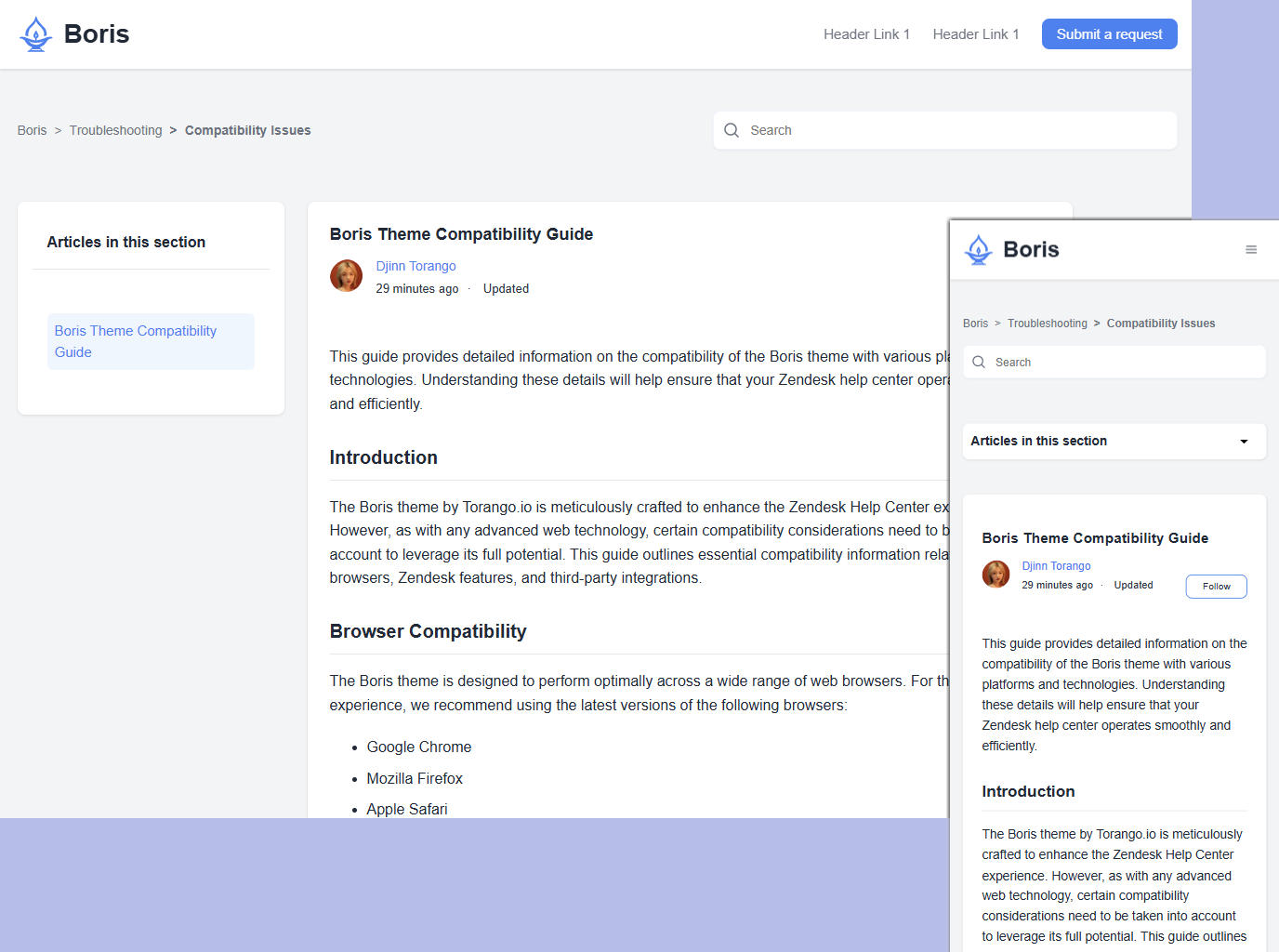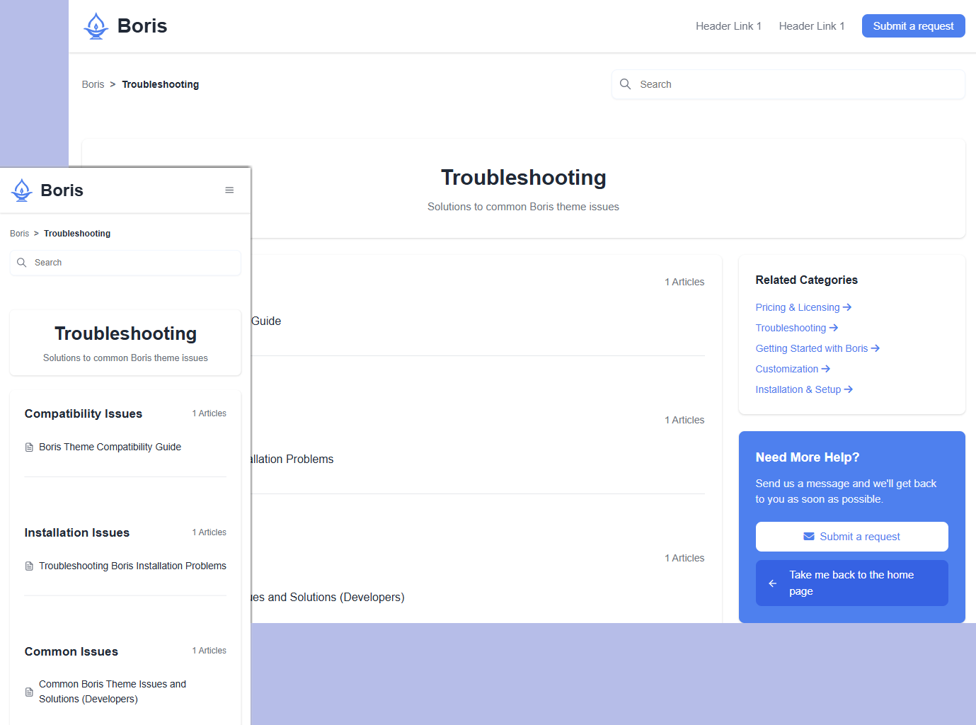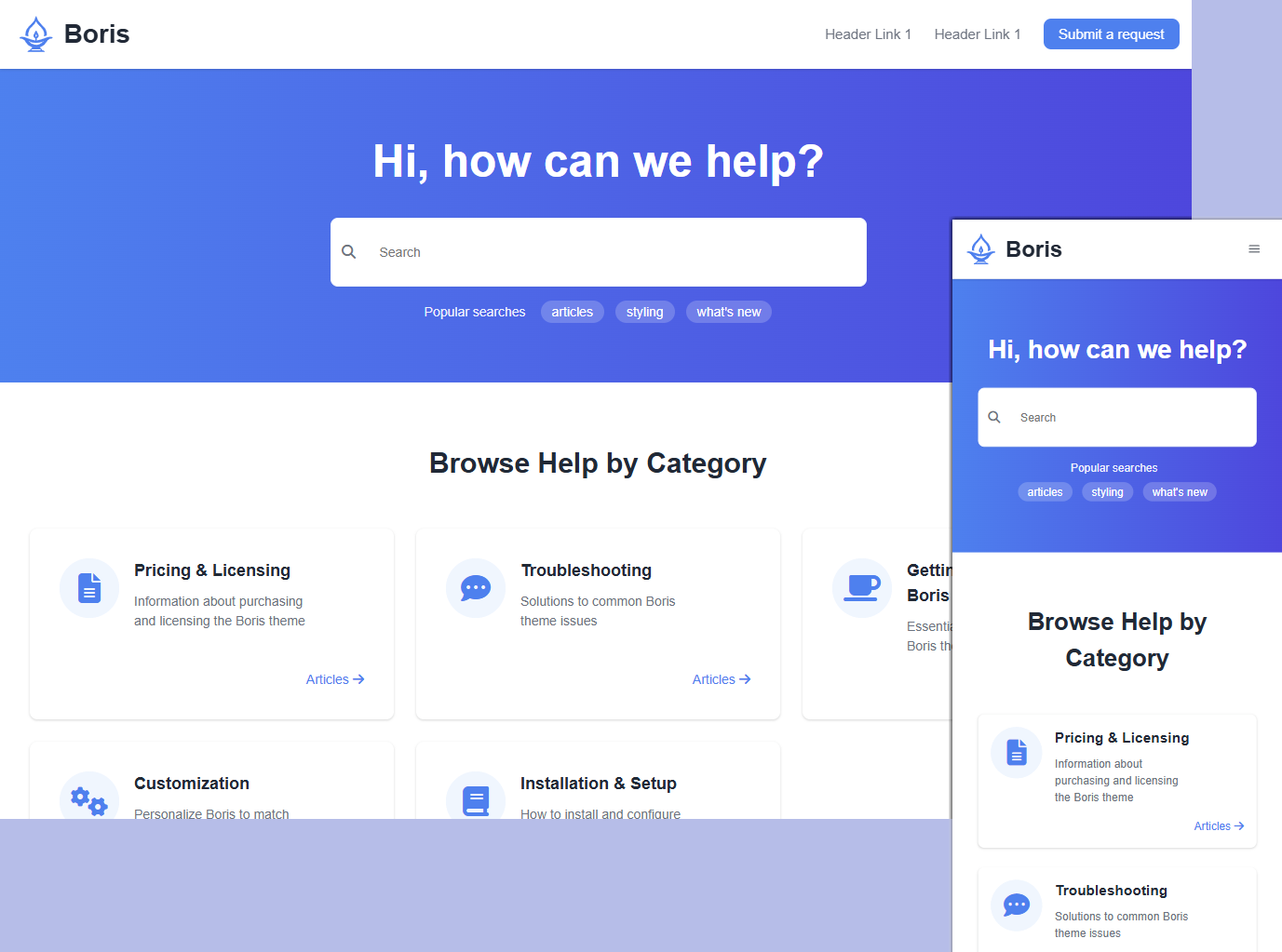 Boris is a modern, feature-rich theme designed specifically for knowledge bases, help centers, and support portals. It combines sleek aesthetics with practical functionality to create an exceptional user experience.