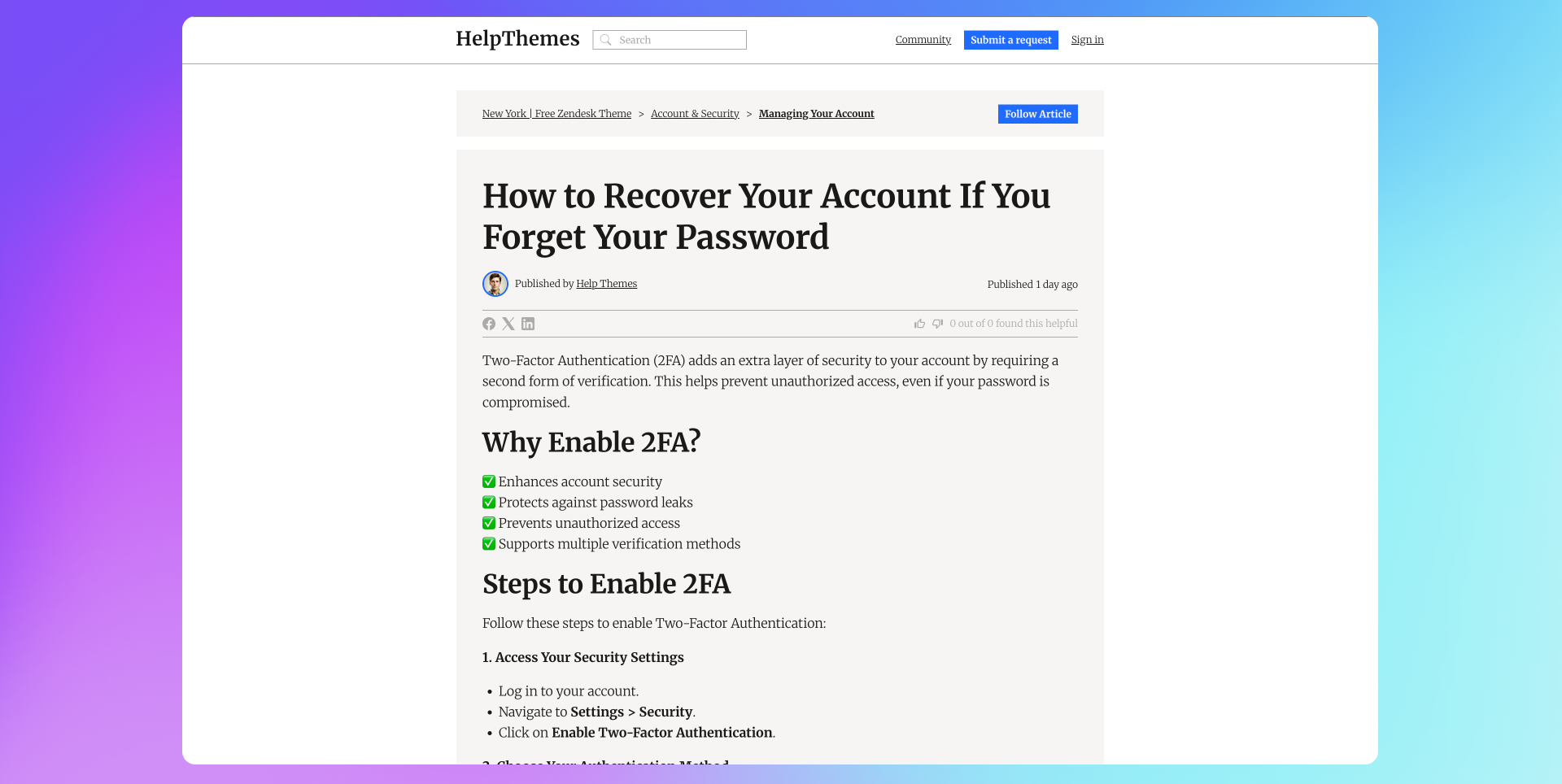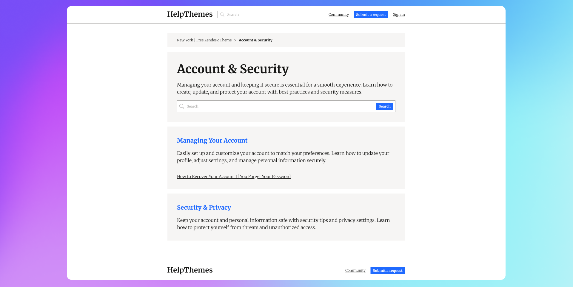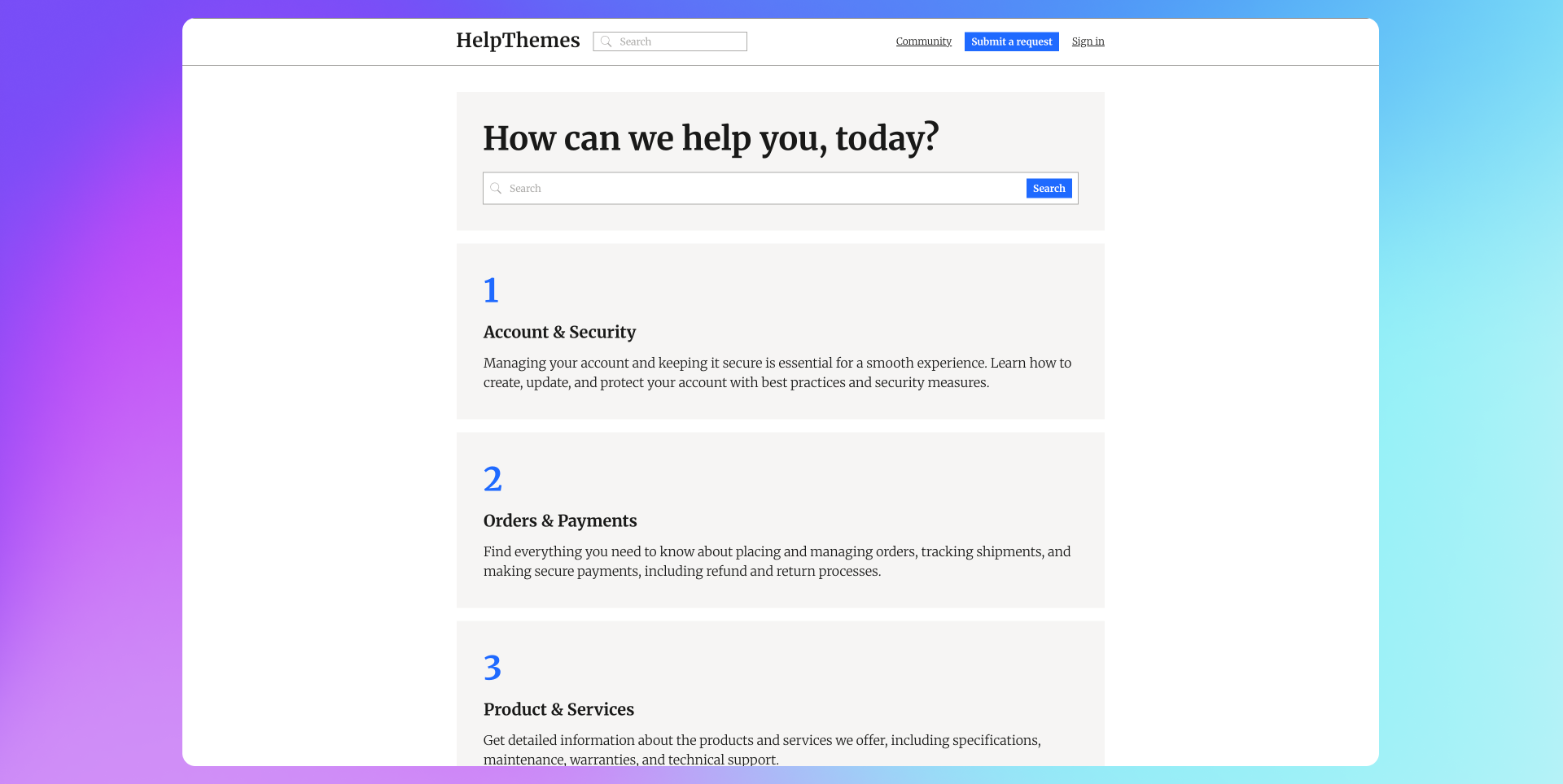 This theme features a modern, minimalist design with crisp typography and a structured layout that prioritizes clarity and ease of use. It’s fully responsive, customizable, adaptable to any brand, and AI-ready for future enhancements. Built on Zendesk’s Templating API V4, this theme balances style and functionality.