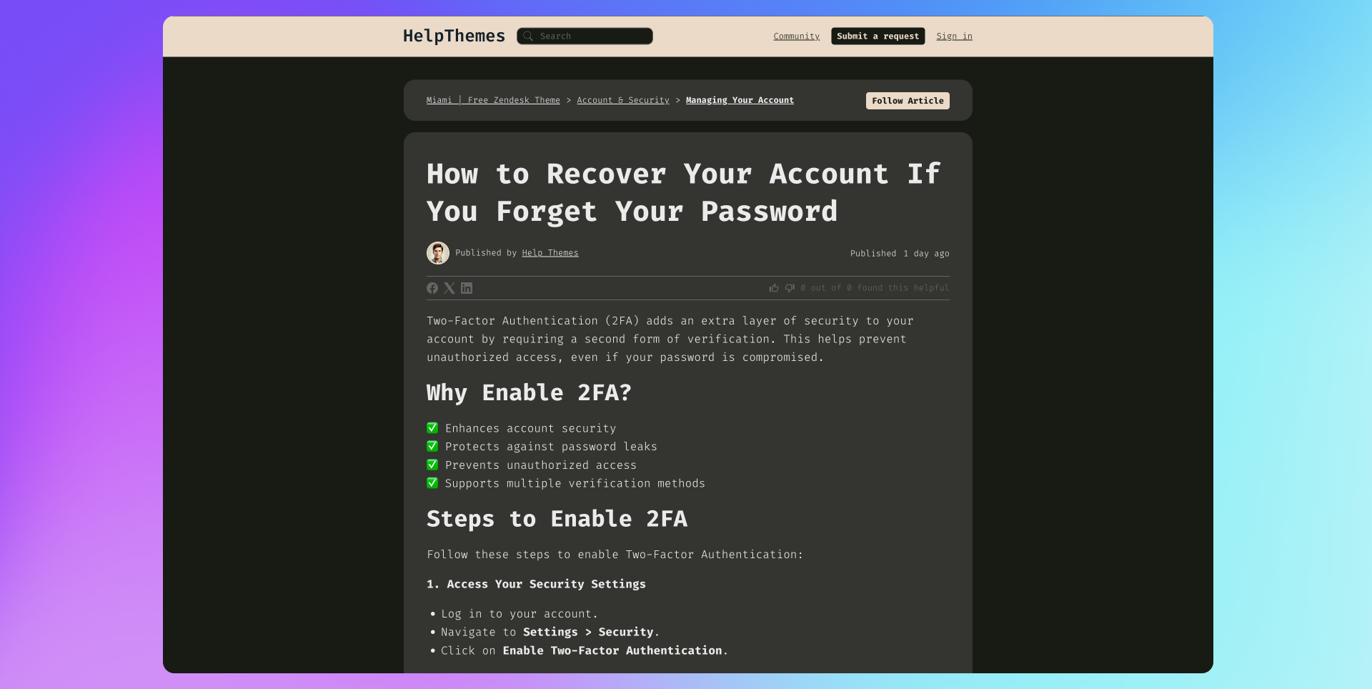 This theme combines a dark, modern aesthetic with rounded containers and a clean, grid-based structure. The theme emphasizes clarity, contrast, and ease of navigation while maintaining a sleek, high-impact look. Fully customizable, responsive, and AI-ready, this theme adapts effortlessly to any brand. Built on Zendesk’s Templating API V4.