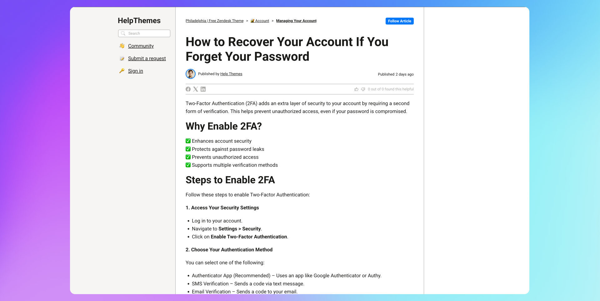 This theme features a clear, functional layout with a sidebar for intuitive navigation and a clean grid structure for organizing content. Its design focuses on clarity, space, and simplicity while maintaining a friendly and approachable tone. Fully responsive, customizable, brand-adaptable, and AI-ready, this theme is built on Zendesk’s Templating API V4.