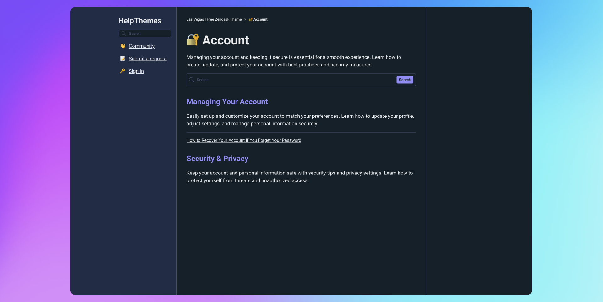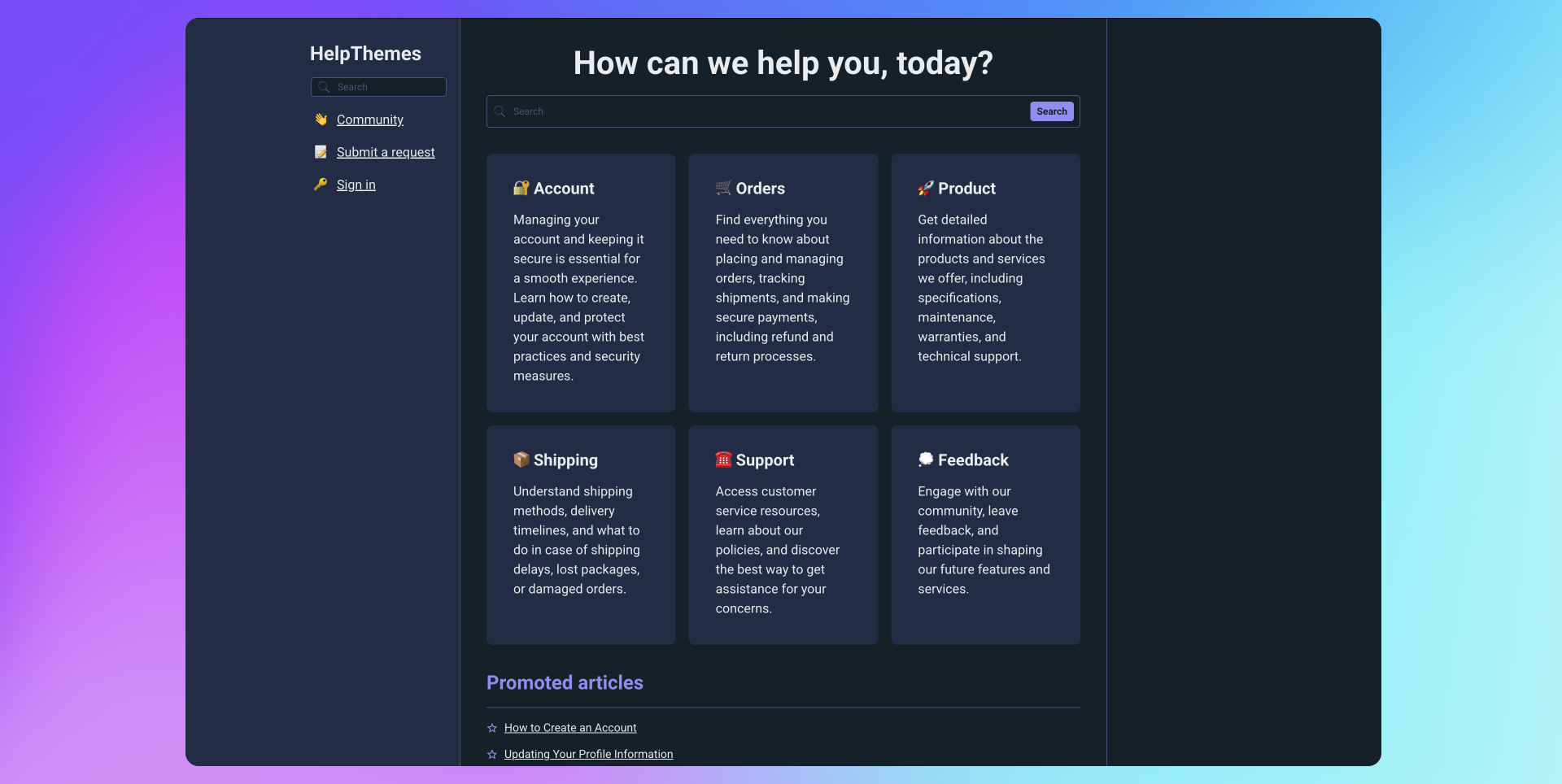 This theme offers a modern dark layout with the same structured, sidebar-based navigation and grid organization as its lighter counterpart. It provides a clean, focused experience designed for clarity and ease of use. Fully responsive, AI-ready, and adaptable to any brand, this theme is built on Zendesk’s Templating API V4.