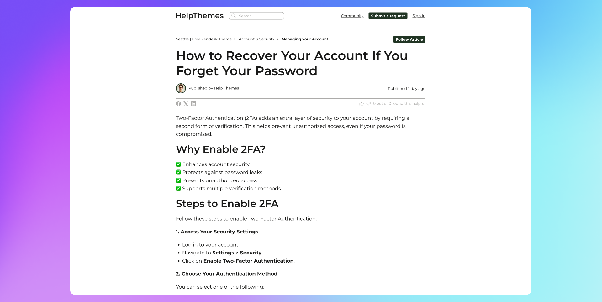 This theme offers a calm and organized layout with an editorial feel — structured blocks, clear headings, and minimalist dividers create a smooth, distraction-free experience. It’s ideal for presenting help content in a clean, easy-to-read format. Fully customizable, responsive, brand-adaptable, and AI-ready, this theme is built on Zendesk’s Templating API V4.