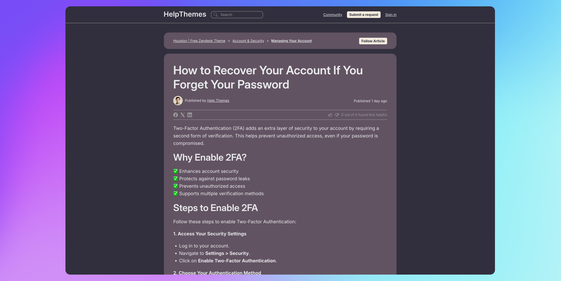 A modern dark theme with large numbered blocks and a clear, structured layout. Fully customizable, responsive, brand-adaptable, and AI-ready. Built with Zendesk’s Templating API V4.