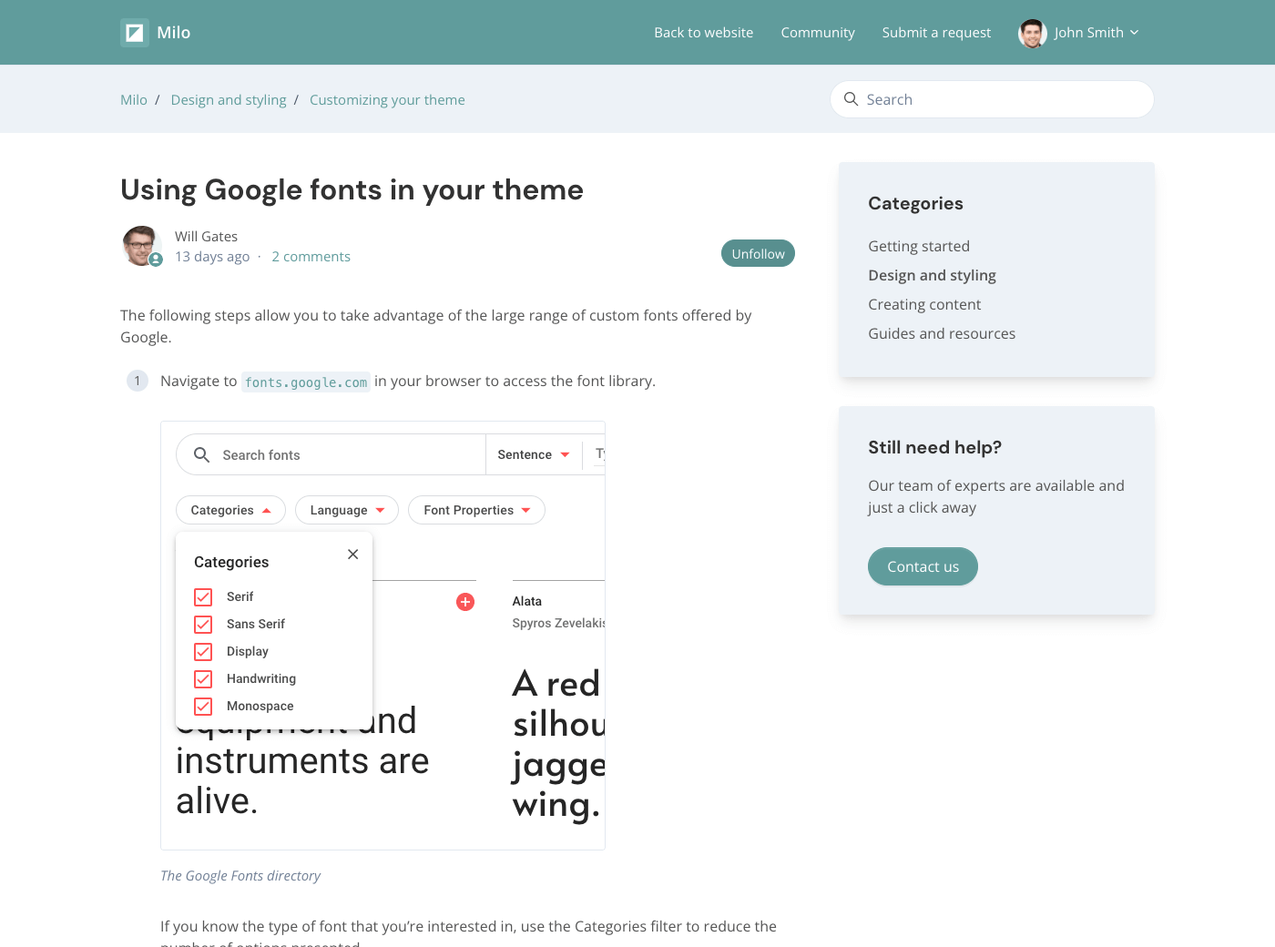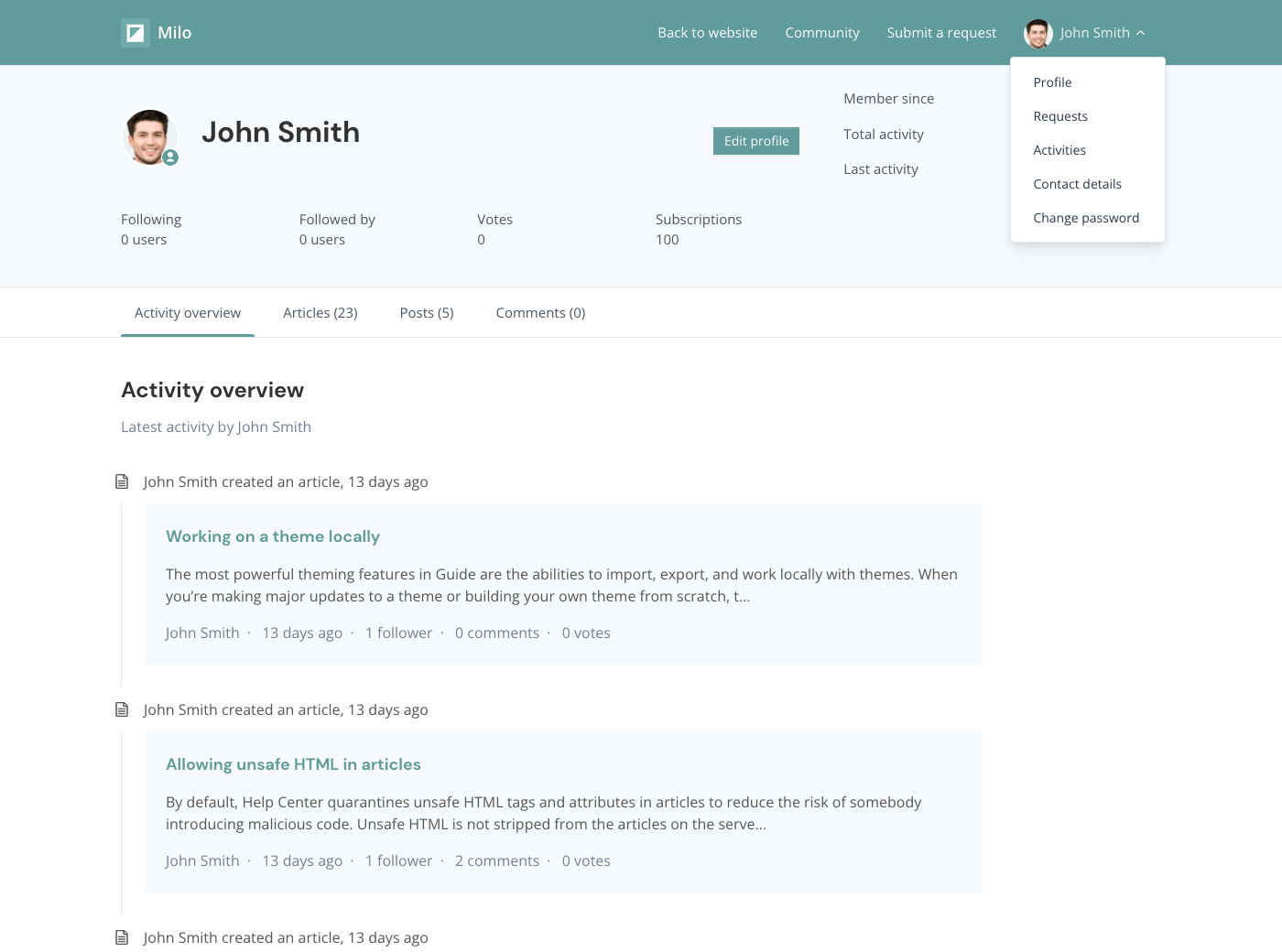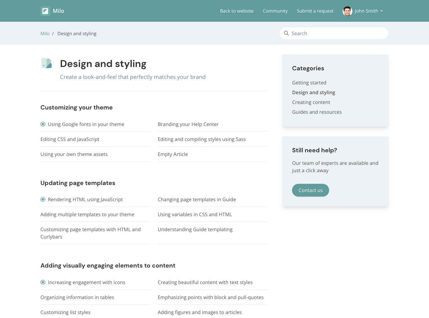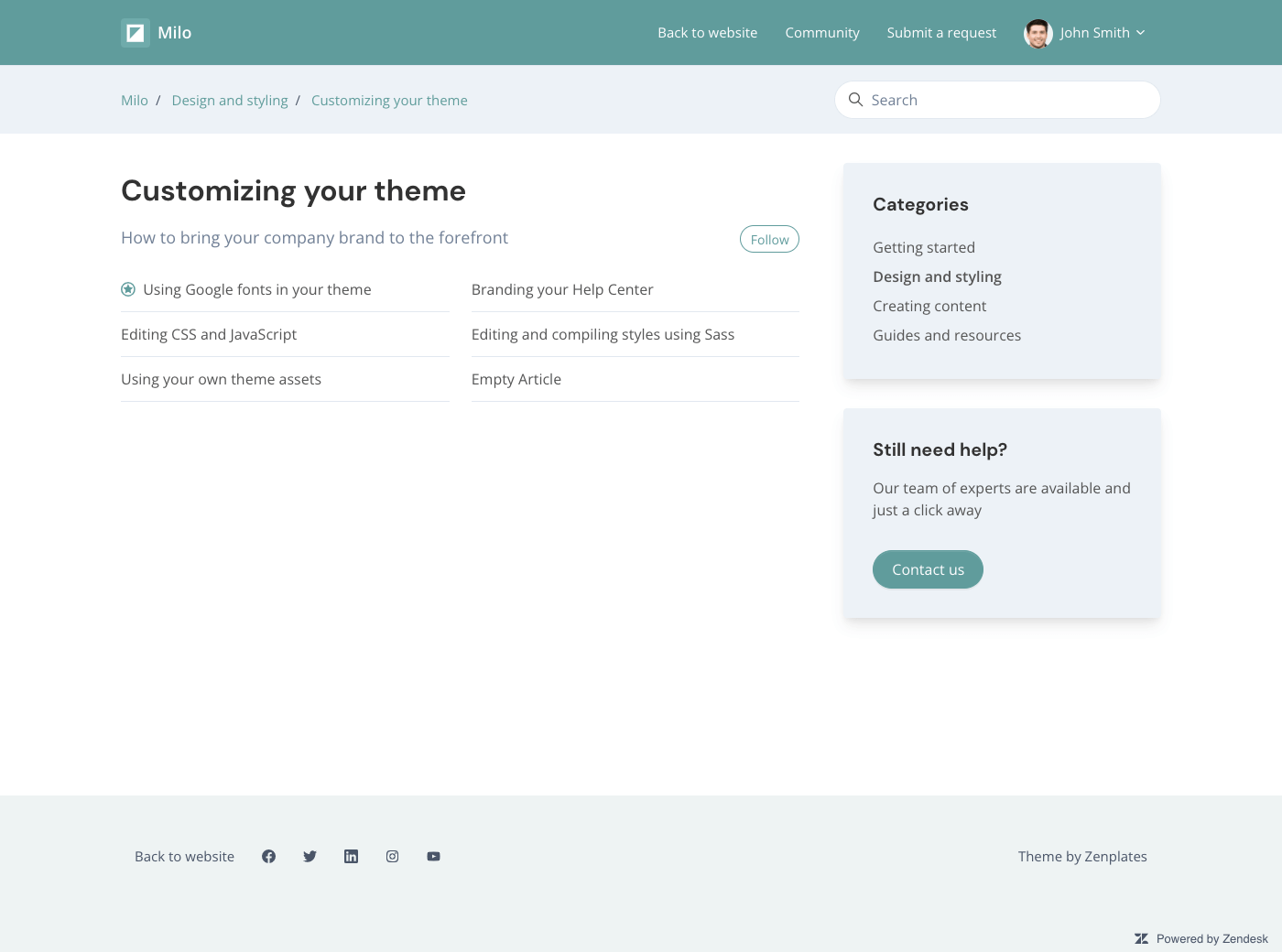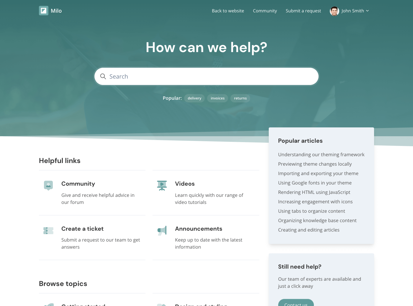 Milo is a beautiful and highly customizable theme for Zendesk Guide. It is designed to serve as a solid foundation on which to build an amazing knowledge base for your customers.