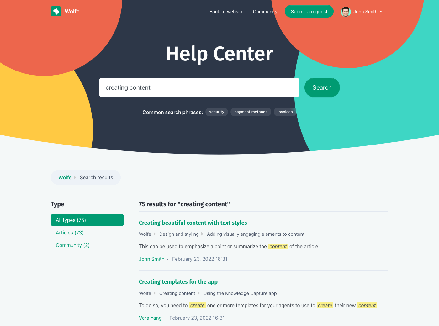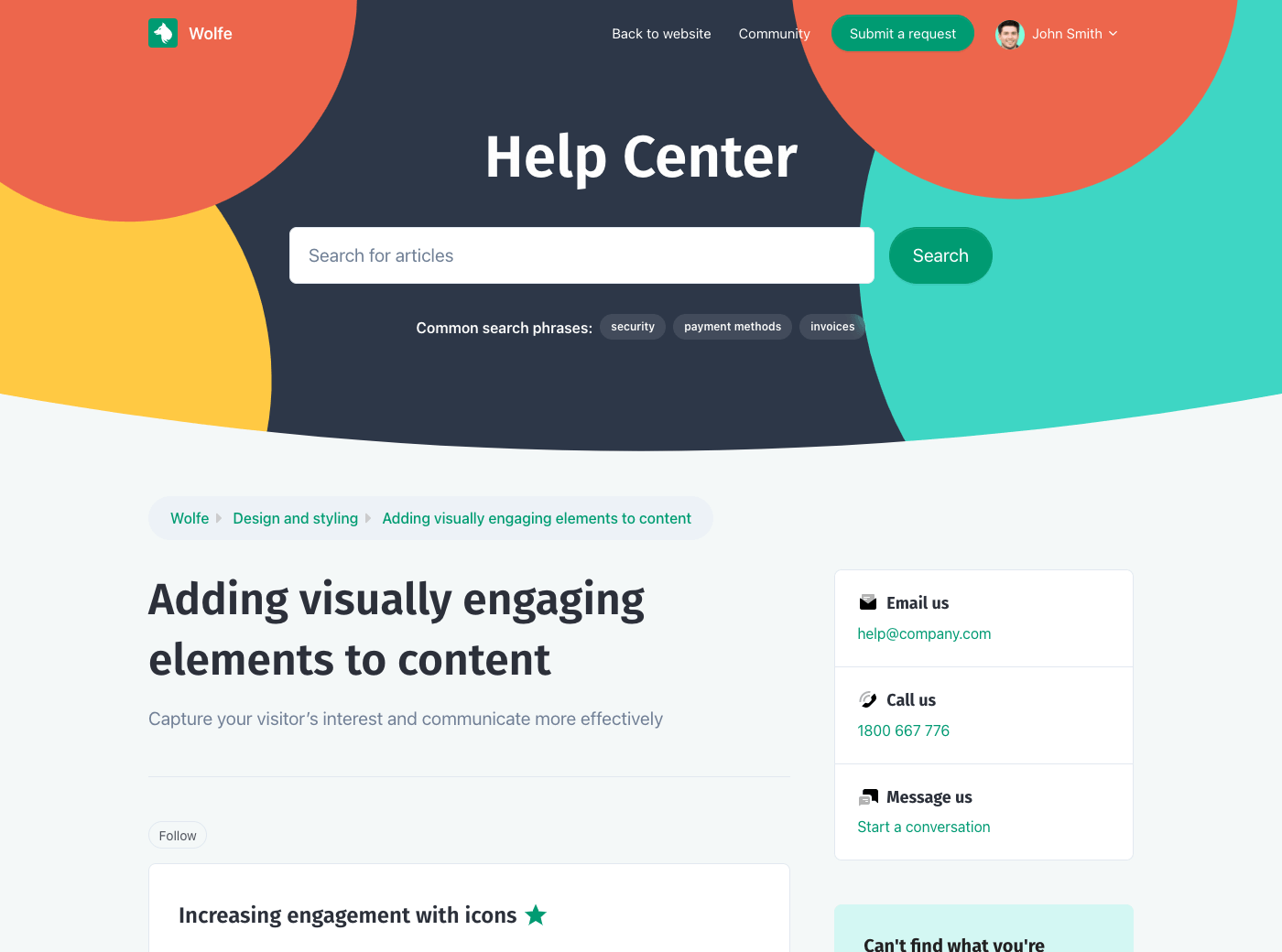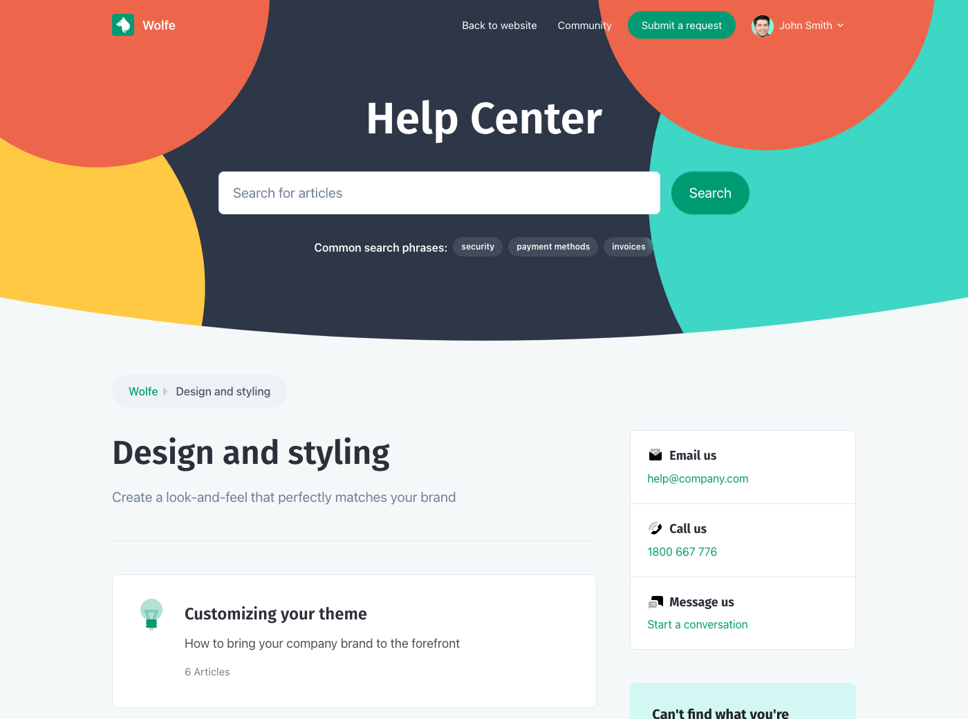 Wolfe is a beautiful, professionally designed Zendesk theme that's packed full of features, including a vibrant hero section with search functionality and configurable search keywords, large, colorful content/custom blocks, optional contact blocks, Video Library functionality, various navigation styles, callouts and much more. Everything can be branded and customized without code, making it easier than ever to launch a new help center that will delight your customers.