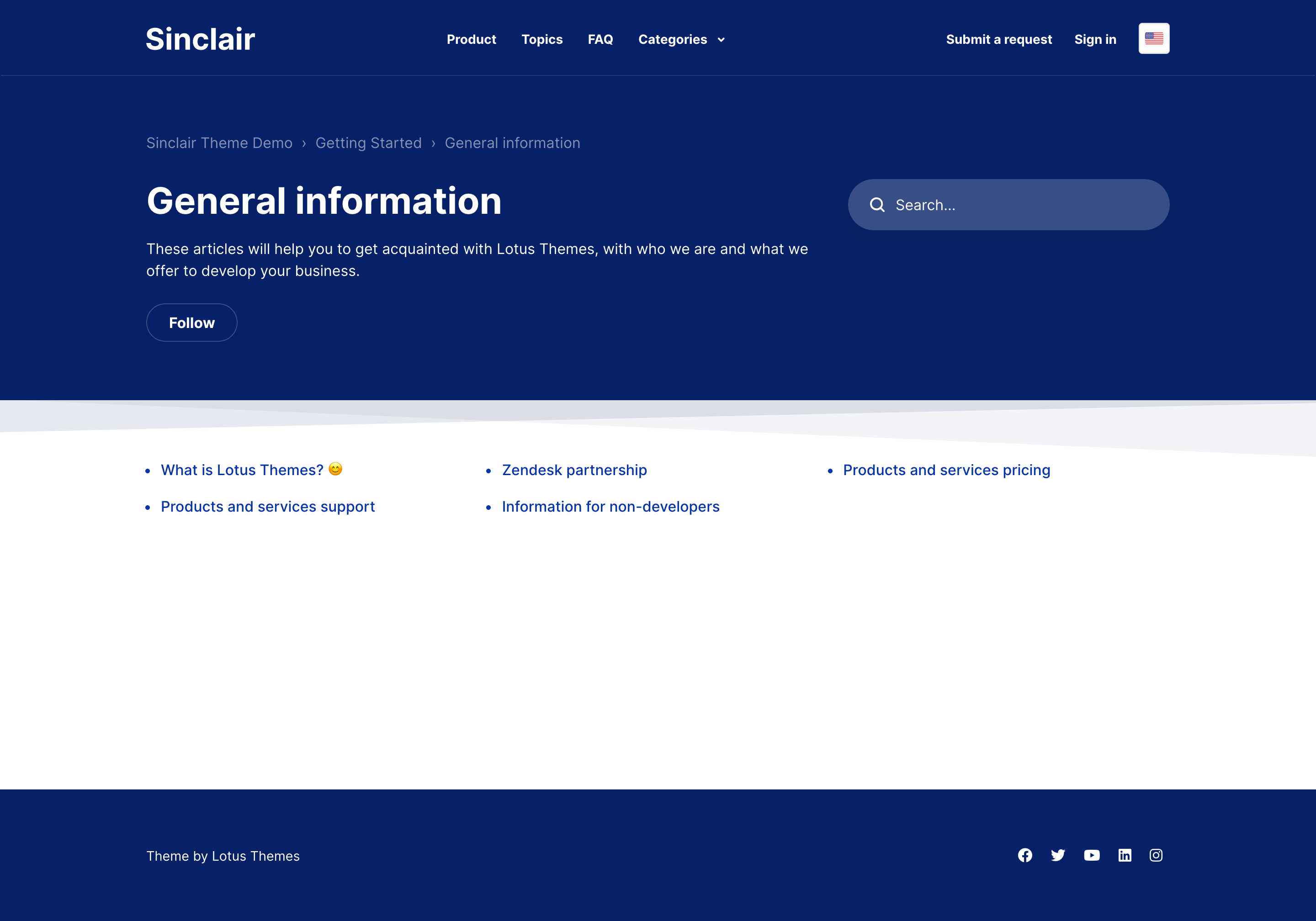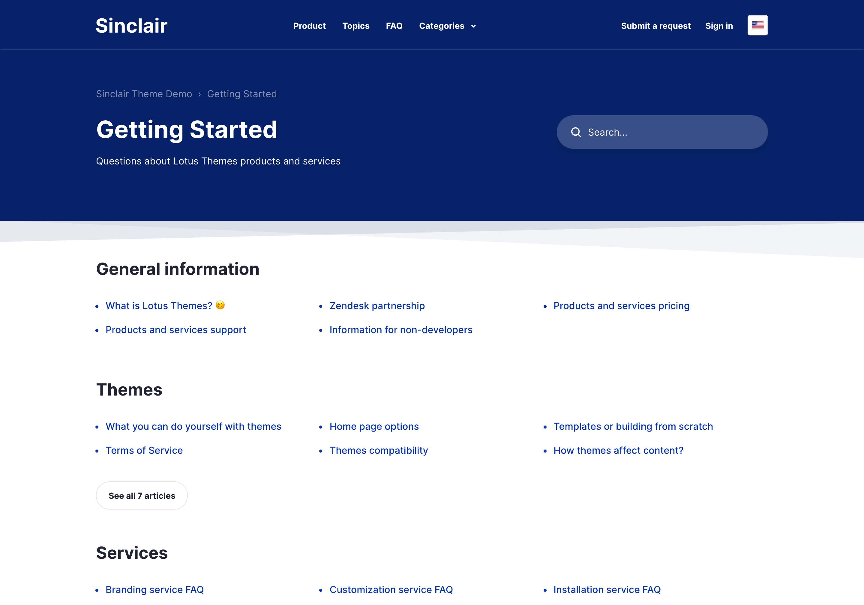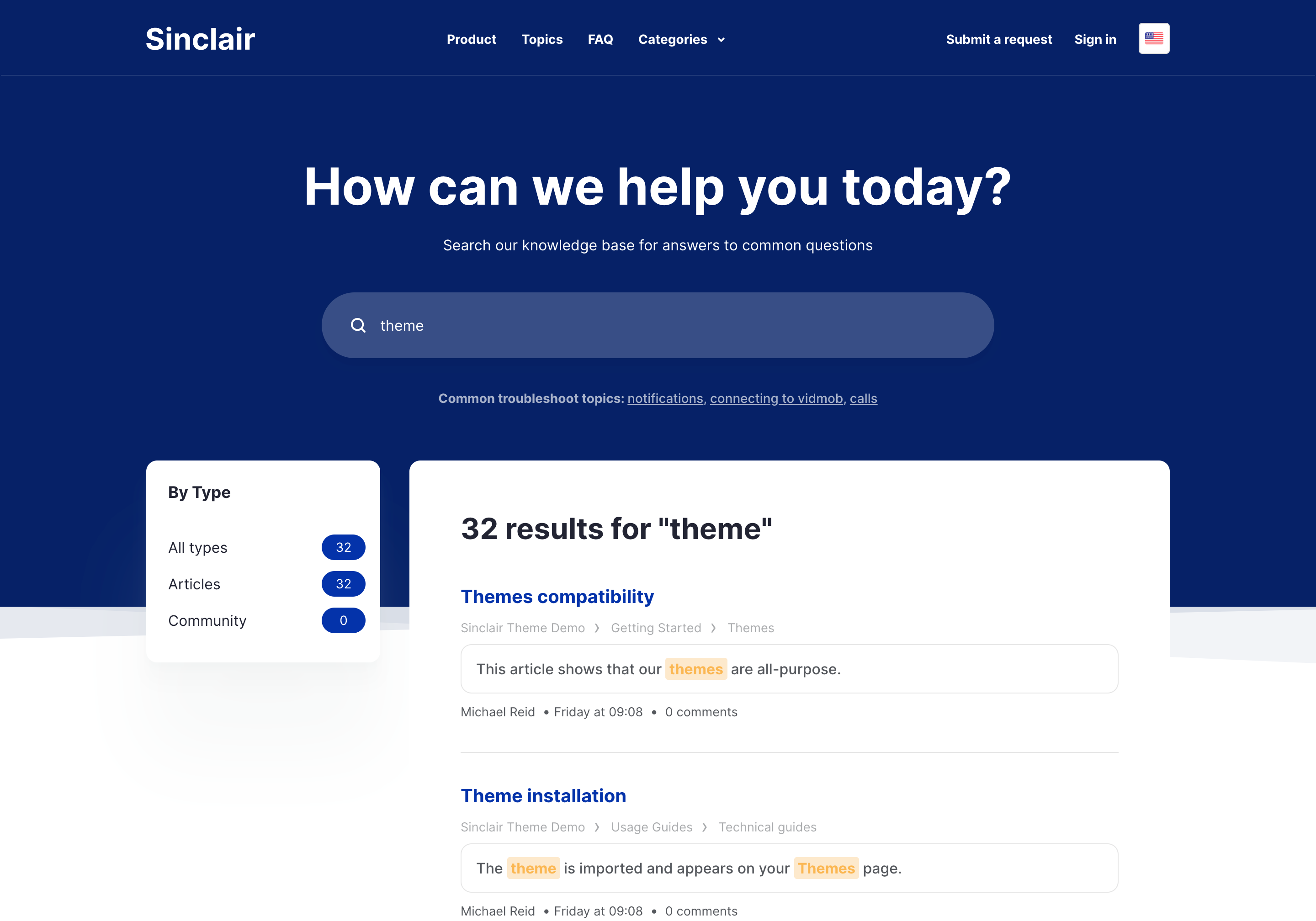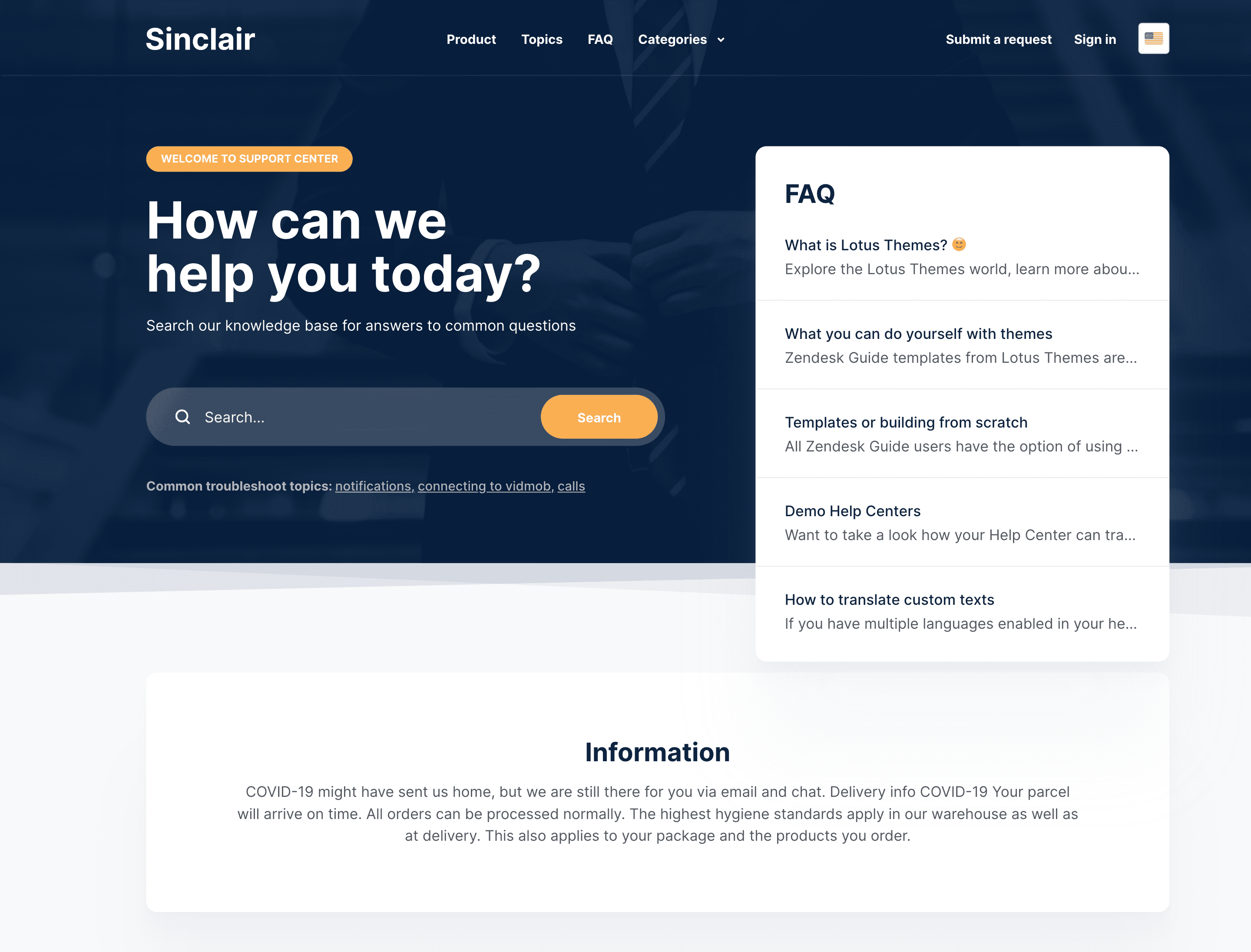 Sinclair is an accessible Zendesk theme that features an FAQ section on the homepage to give quick answers to common questions right at the beginning of the help center experience.