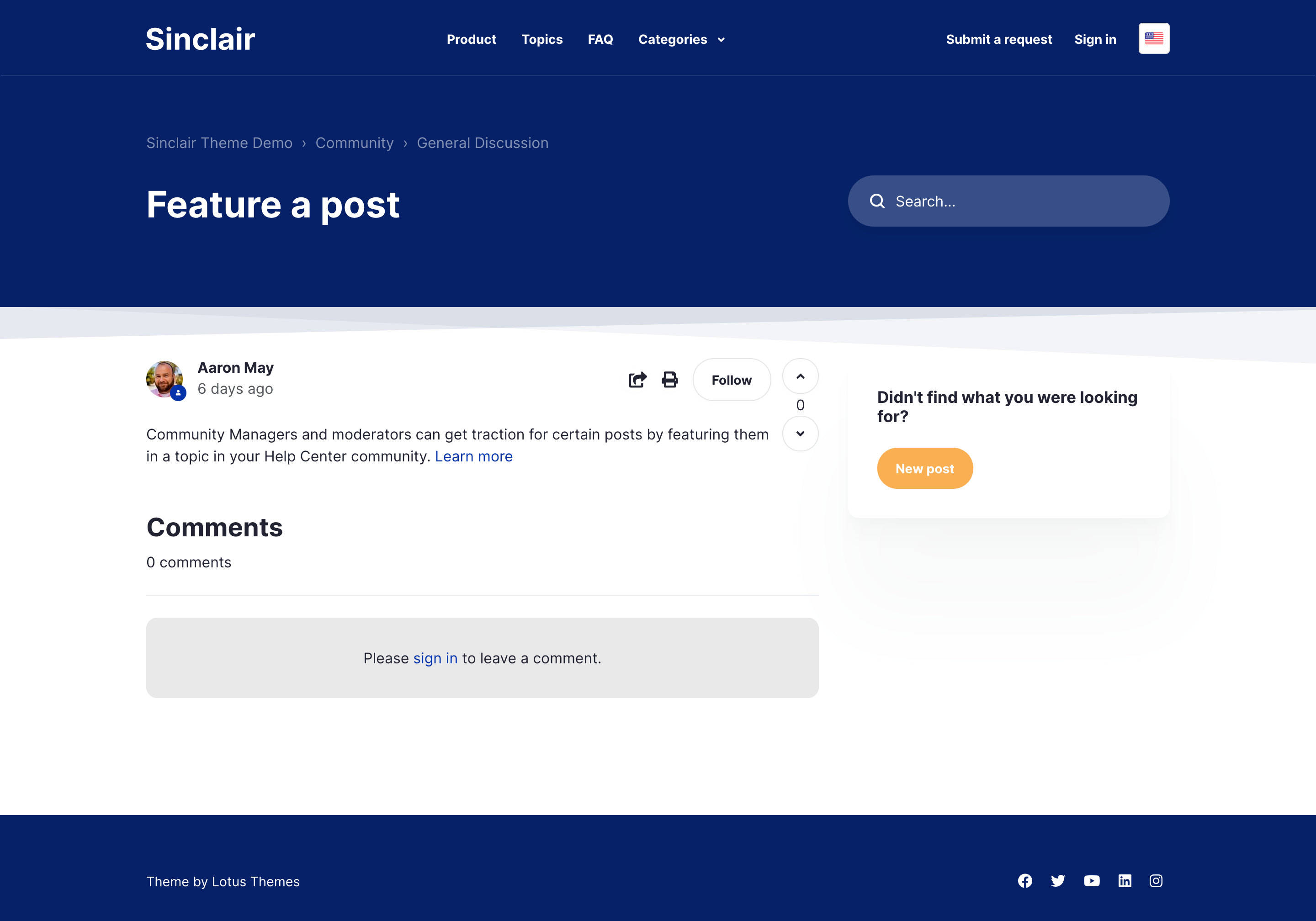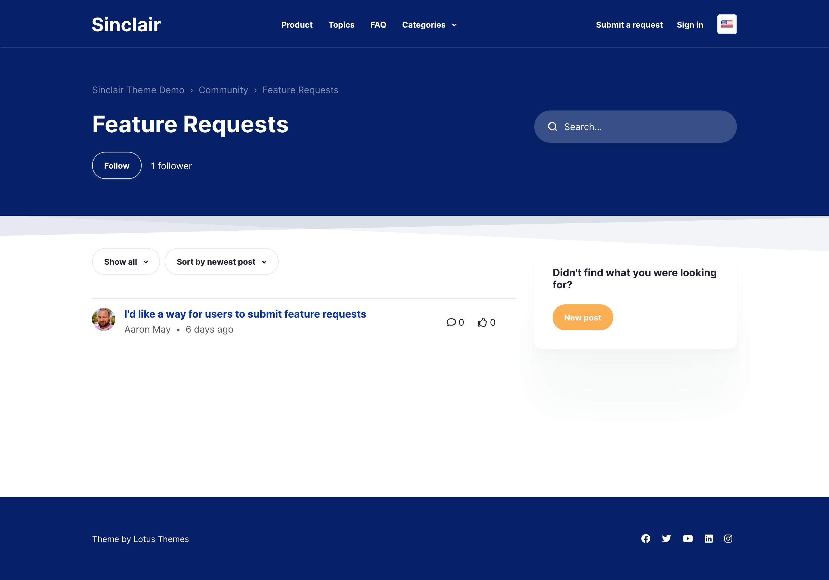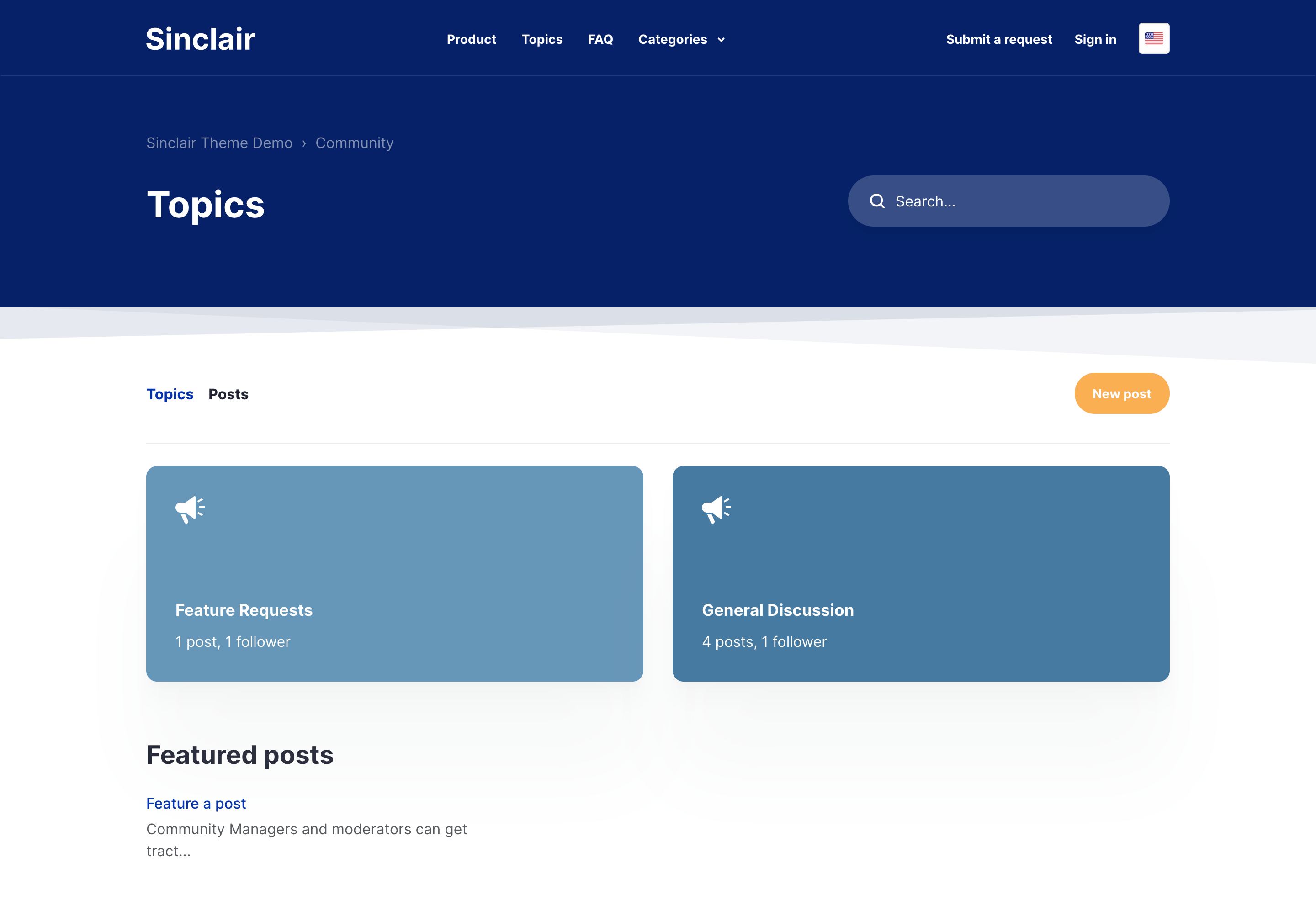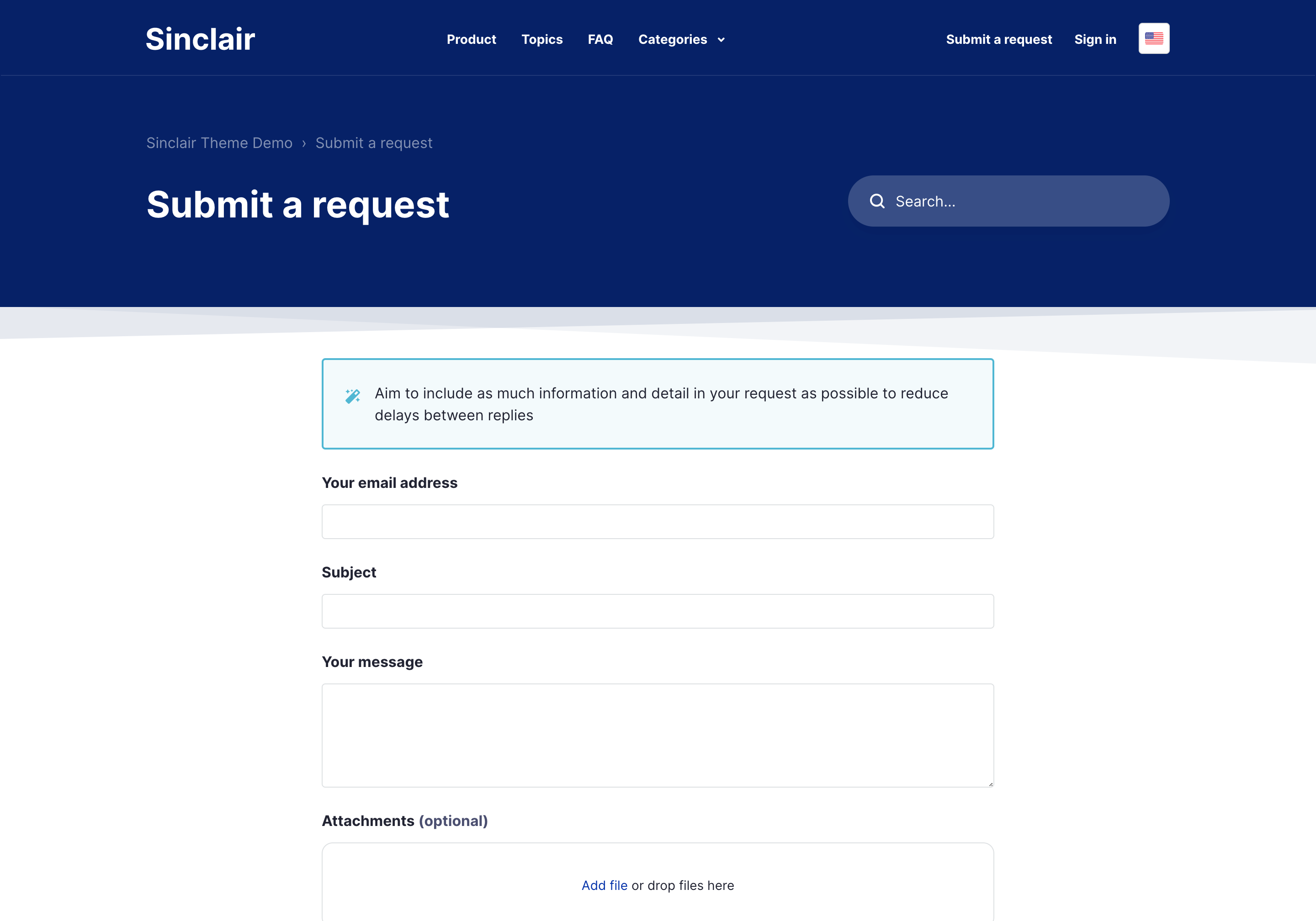 Sinclair is an accessible Zendesk theme that features an FAQ section on the homepage to give quick answers to common questions right at the beginning of the help center experience.