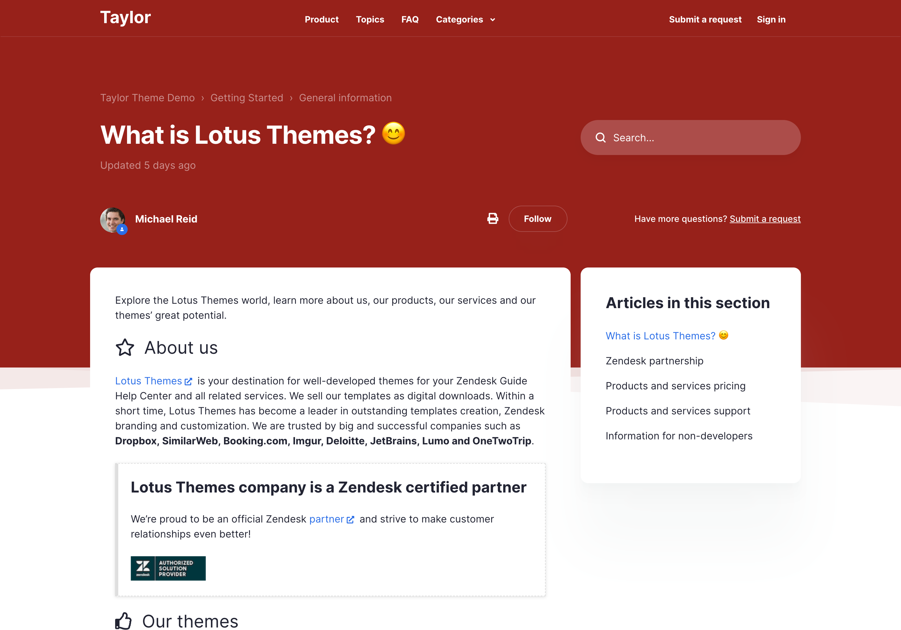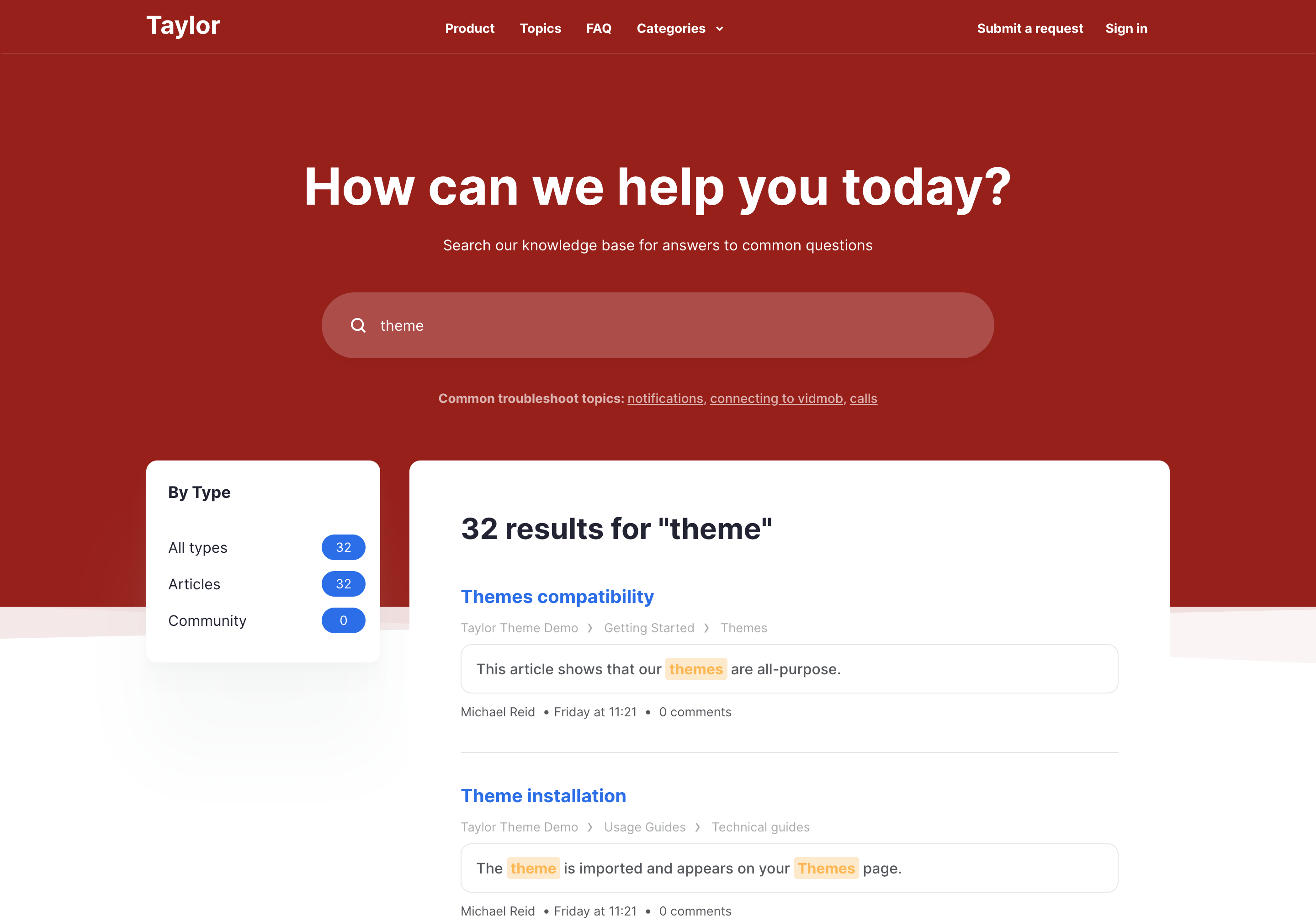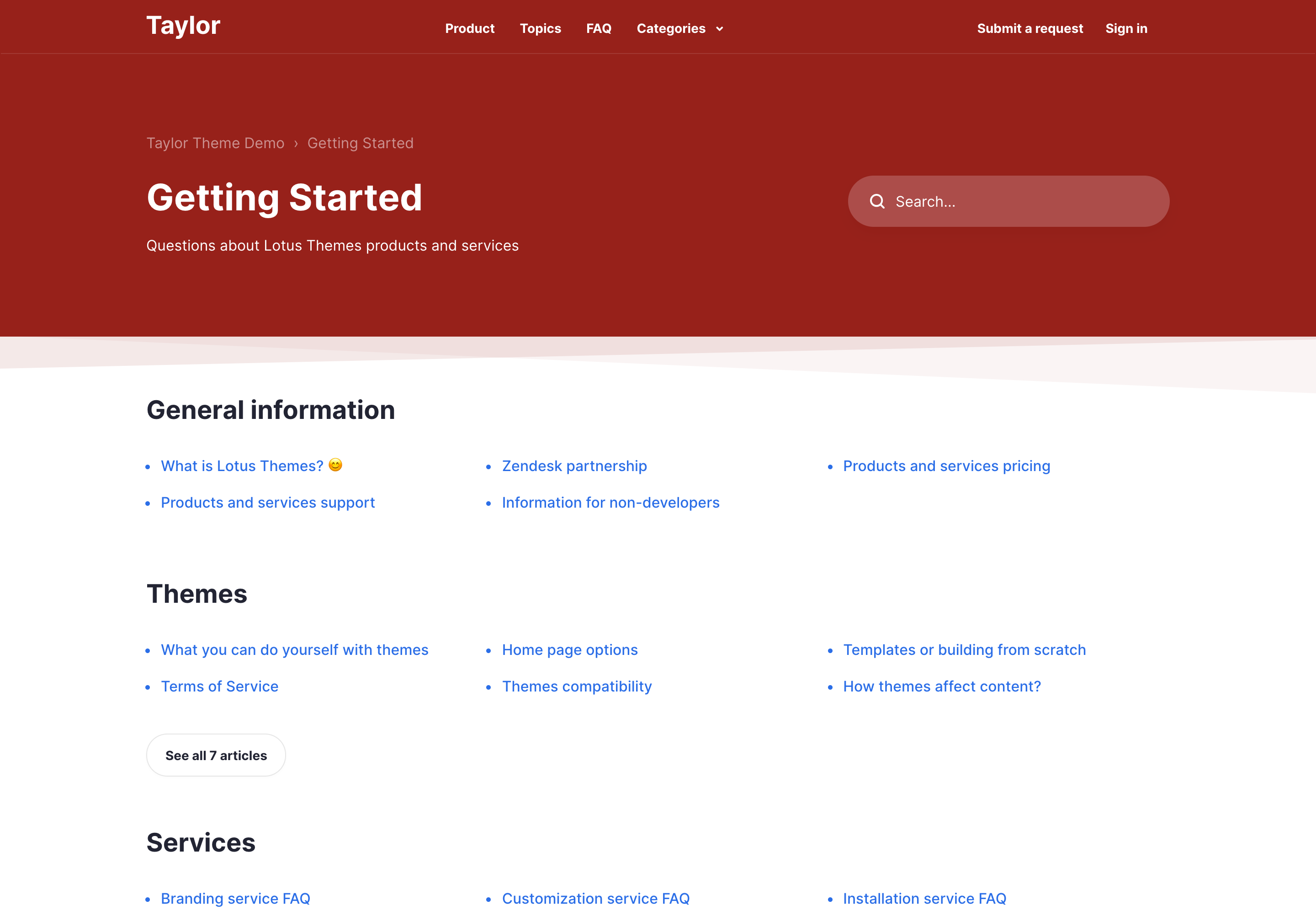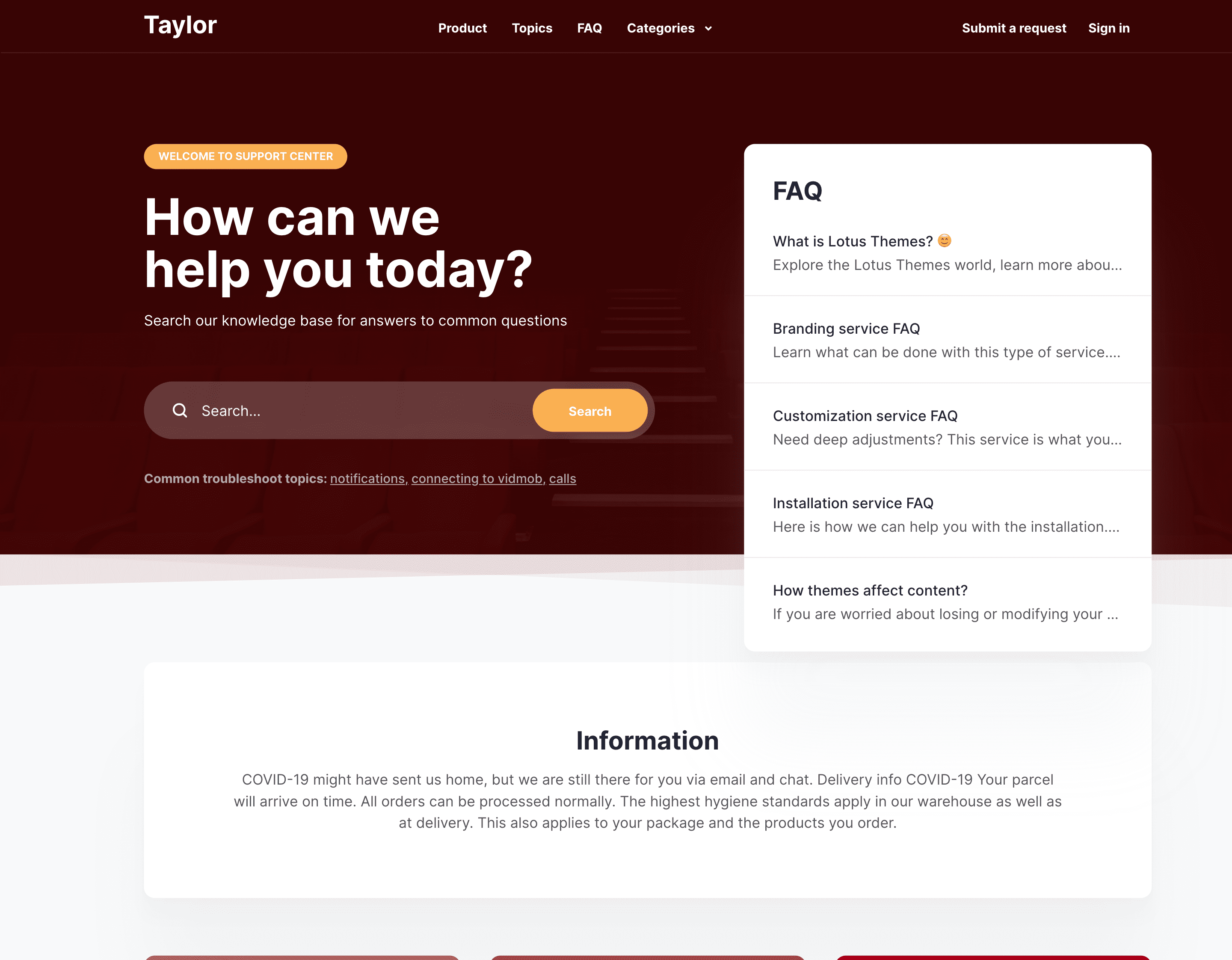 Taylor is an accessible Zendesk theme that features an FAQ section on the homepage to give quick answers to common questions right at the beginning of the help center experience.
