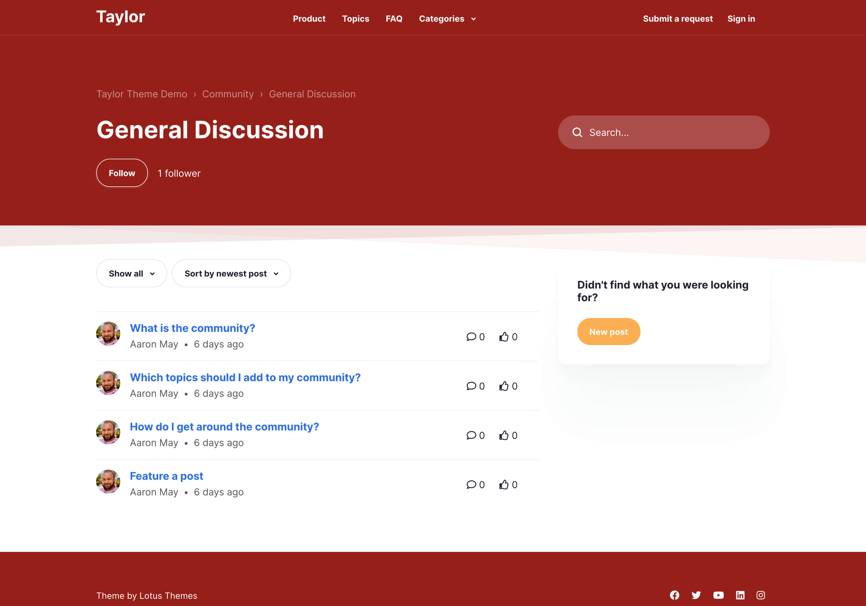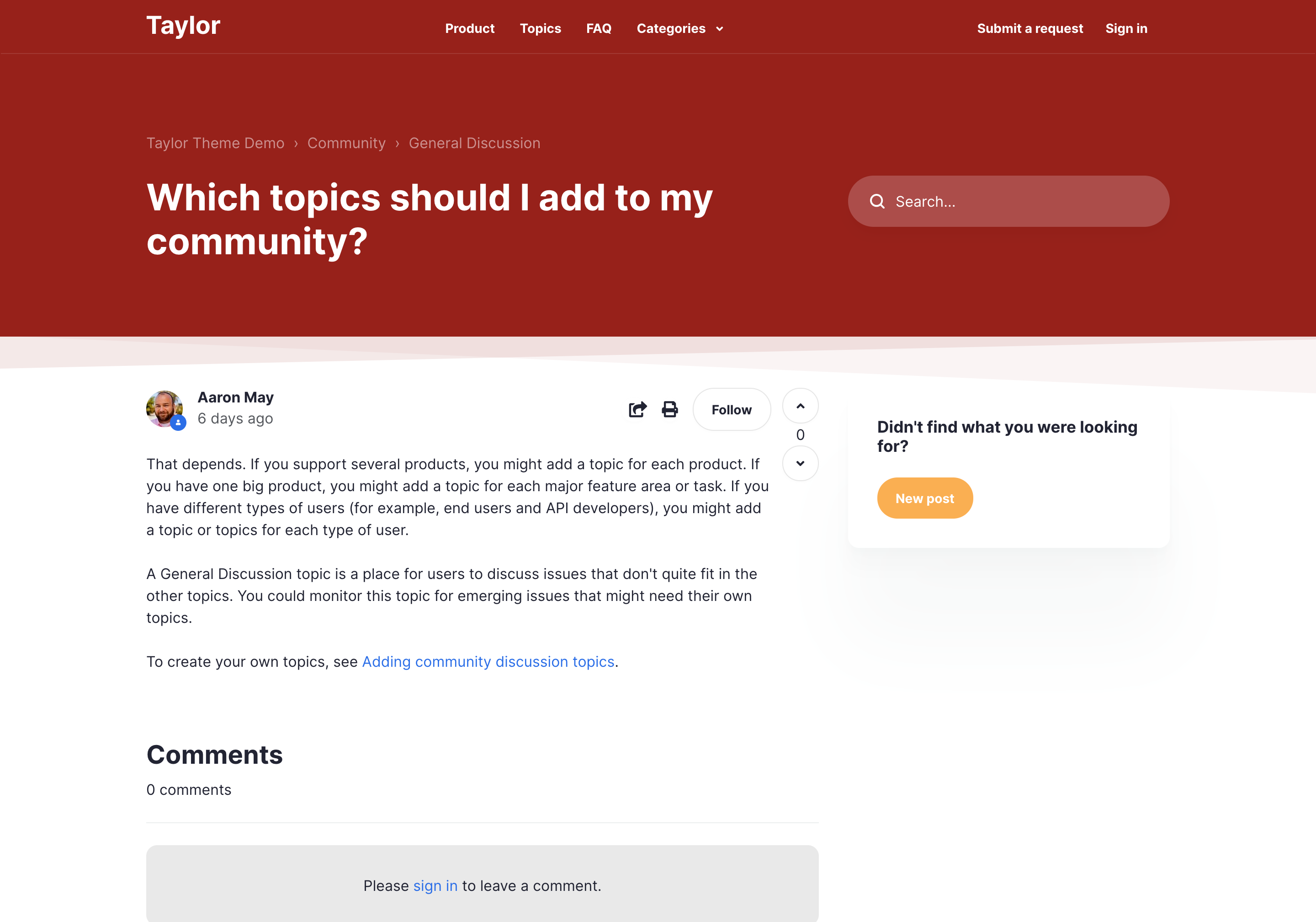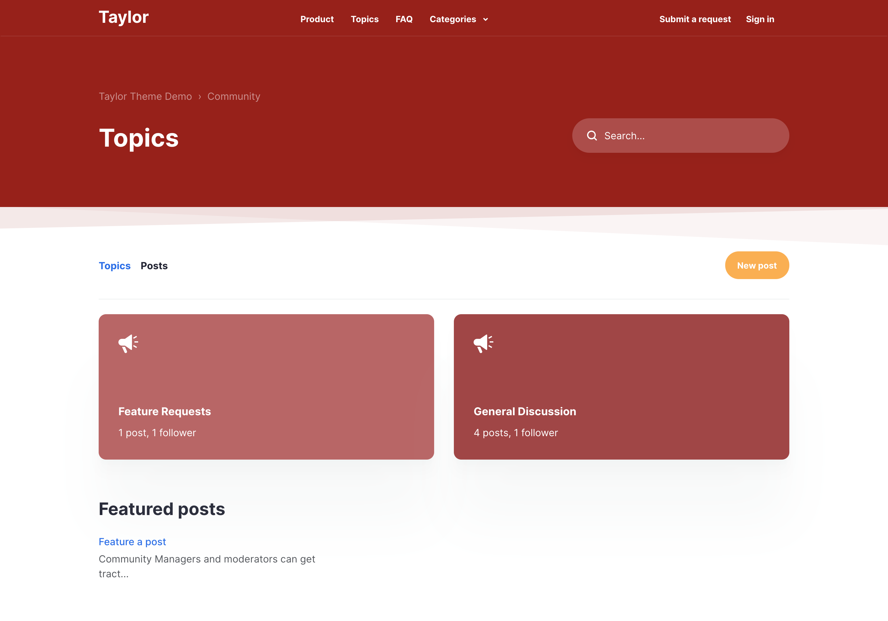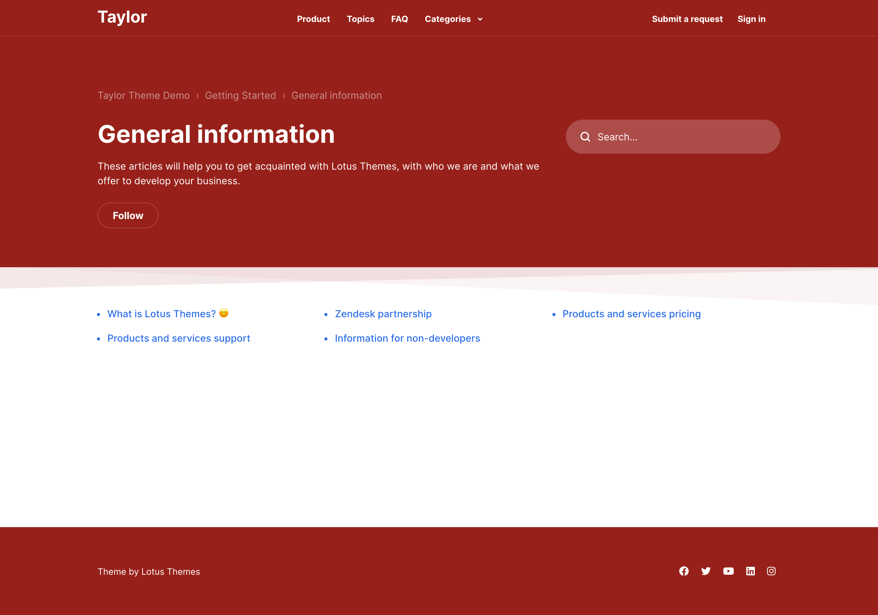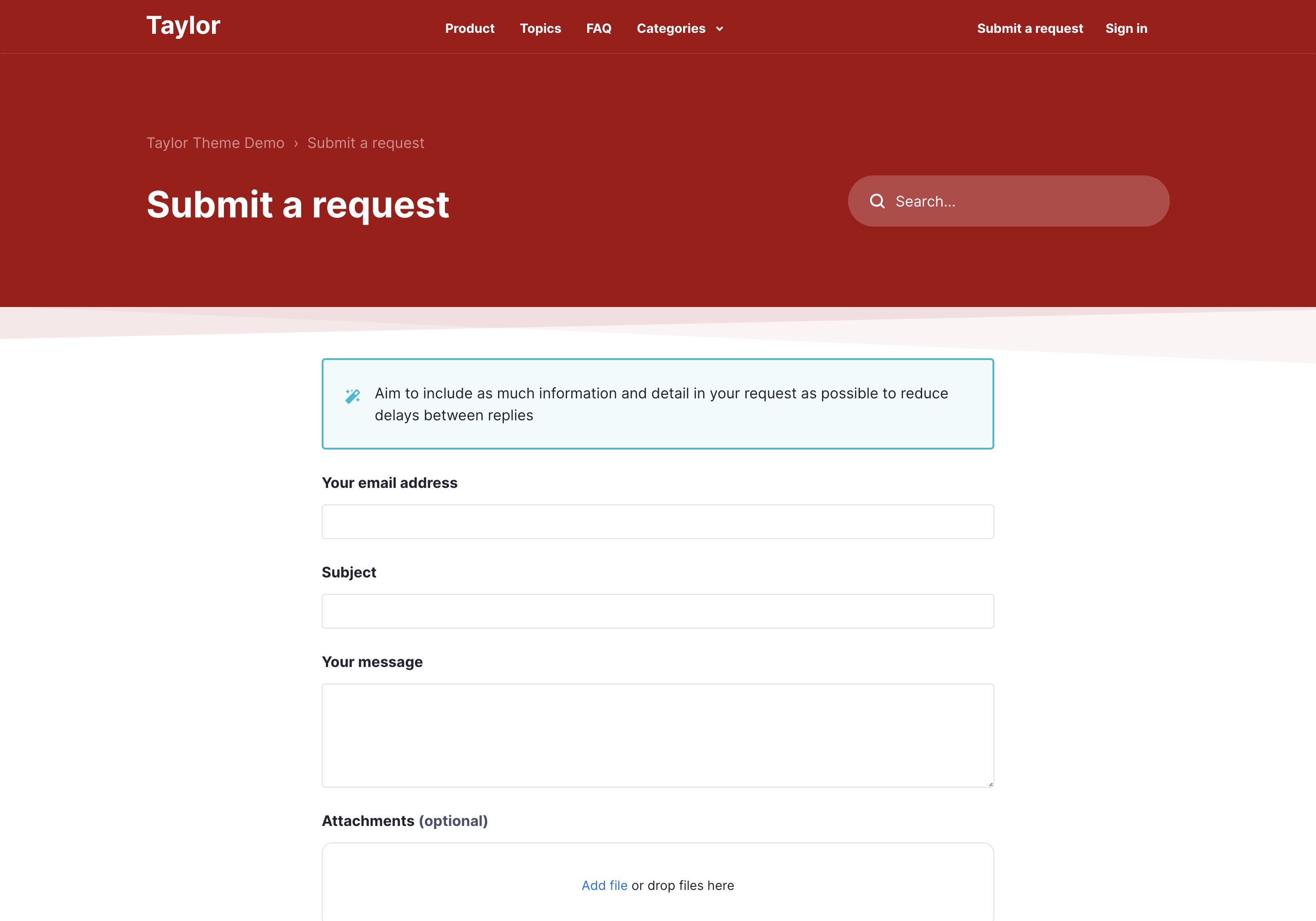 Taylor is an accessible Zendesk theme that features an FAQ section on the homepage to give quick answers to common questions right at the beginning of the help center experience.