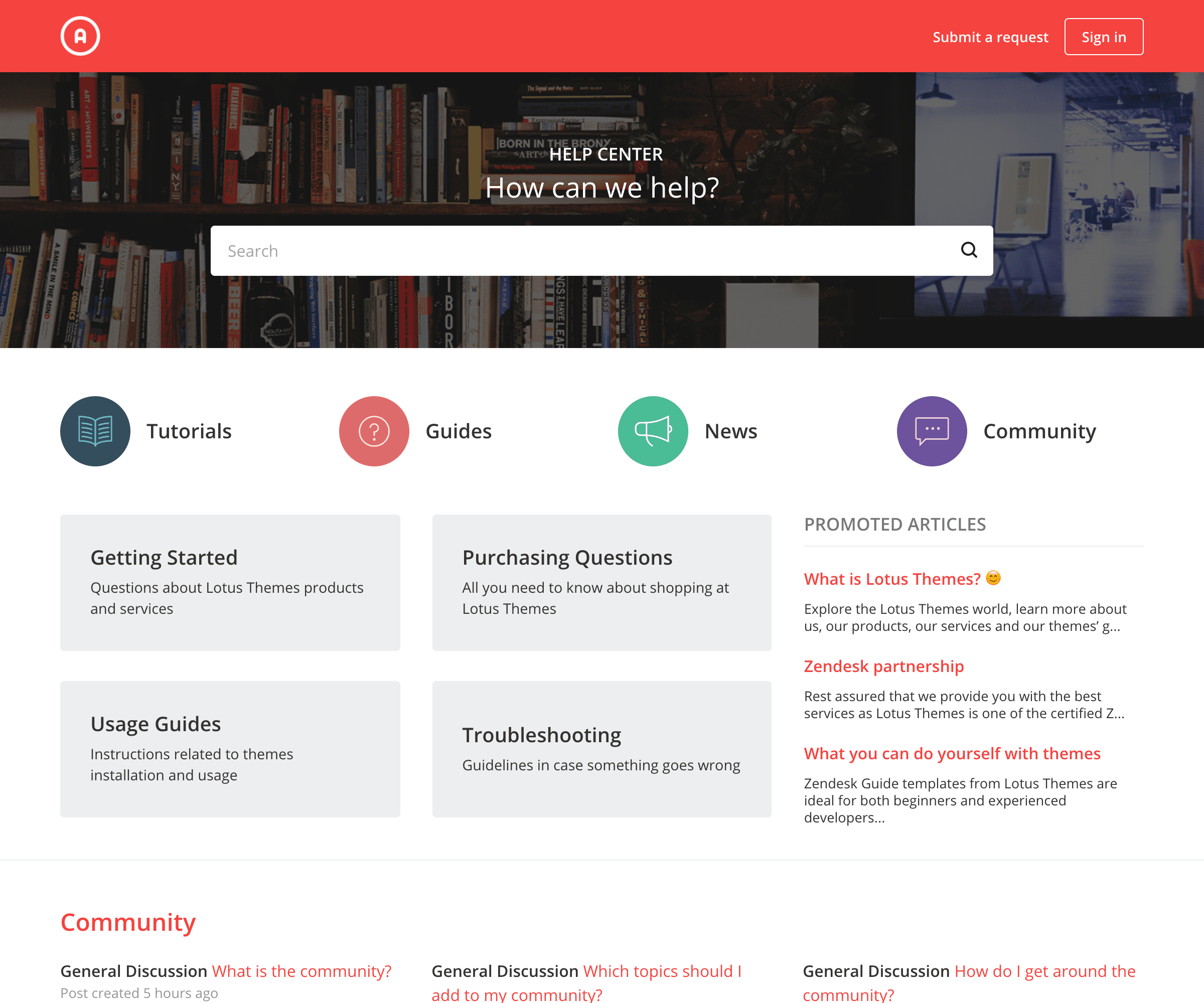 Extend default Zendesk functionality with additional features like Side Navigation, Table of contents, Alerts, Contacts widget, Prev Next buttons, Community hot posts, Server status, Video gallery, Extra level of content, and Multiple templates for pages. You should buy these extensions separately, and they are fully compatible with all templates from Lotus Themes.