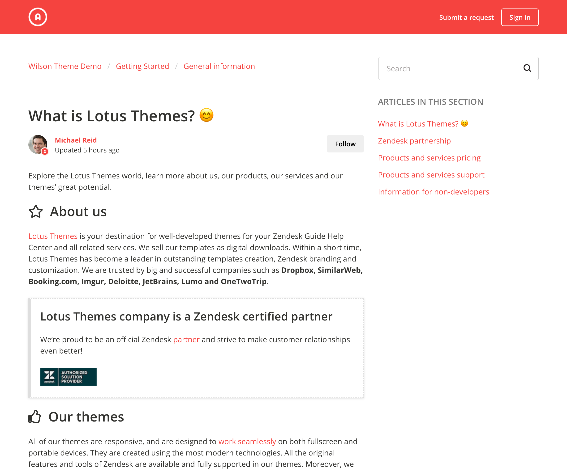 Wilson is a mobile-friendly Zendesk theme with a non-standard layout. It lets you organize help center elements as you wish and keep navigation super easy. You can change page layouts to suit your needs - mix custom blocks, a category list, and a category tree as you wish.